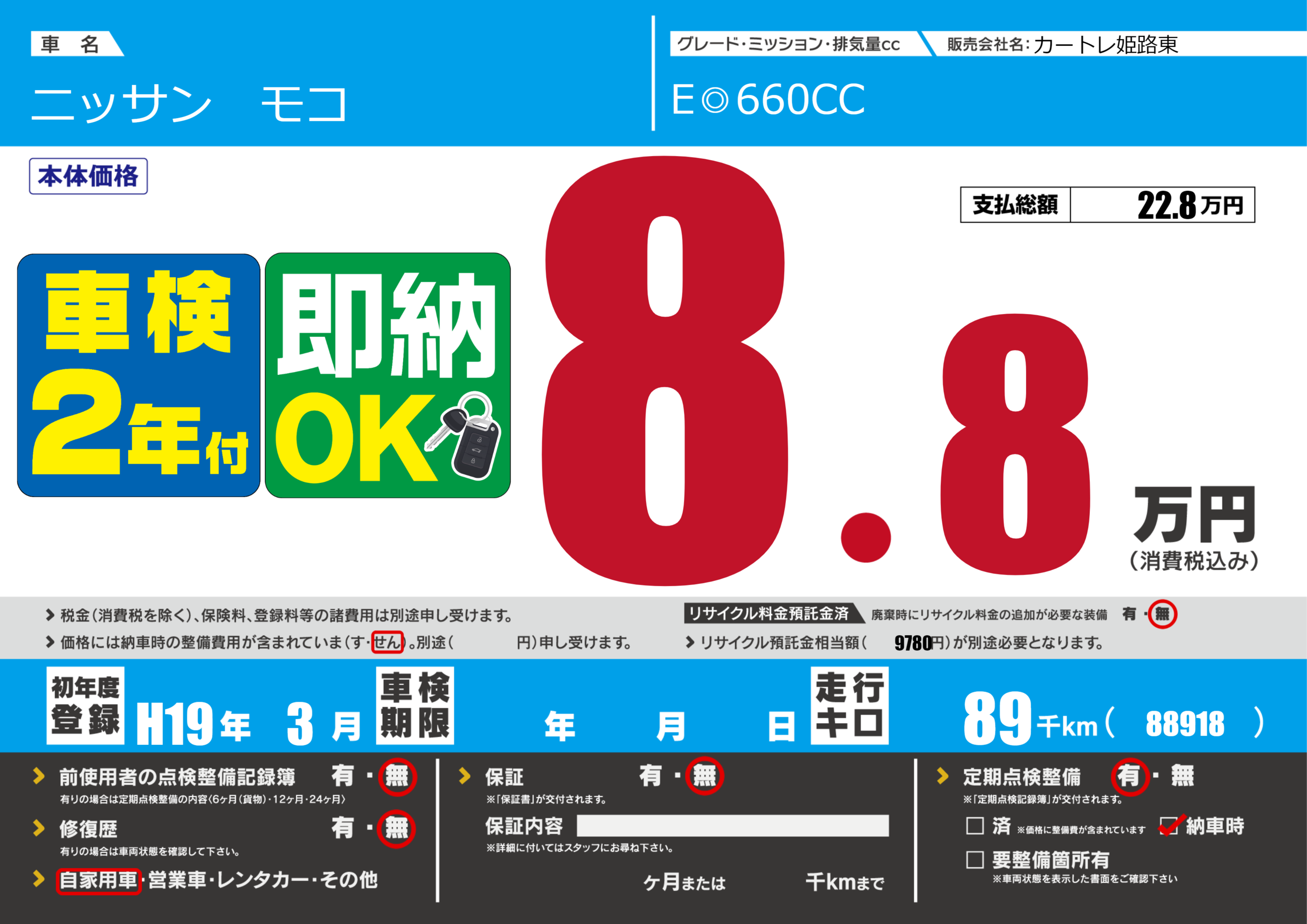 | 車名 | ニッサン モコ | グレード ミッション 排気量 |