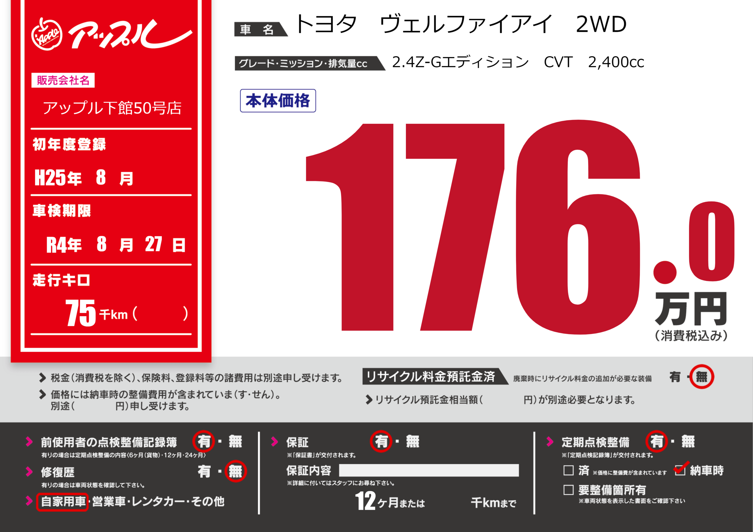 保証付き 保証内容(---) 12ヶ月または()千kmまで |