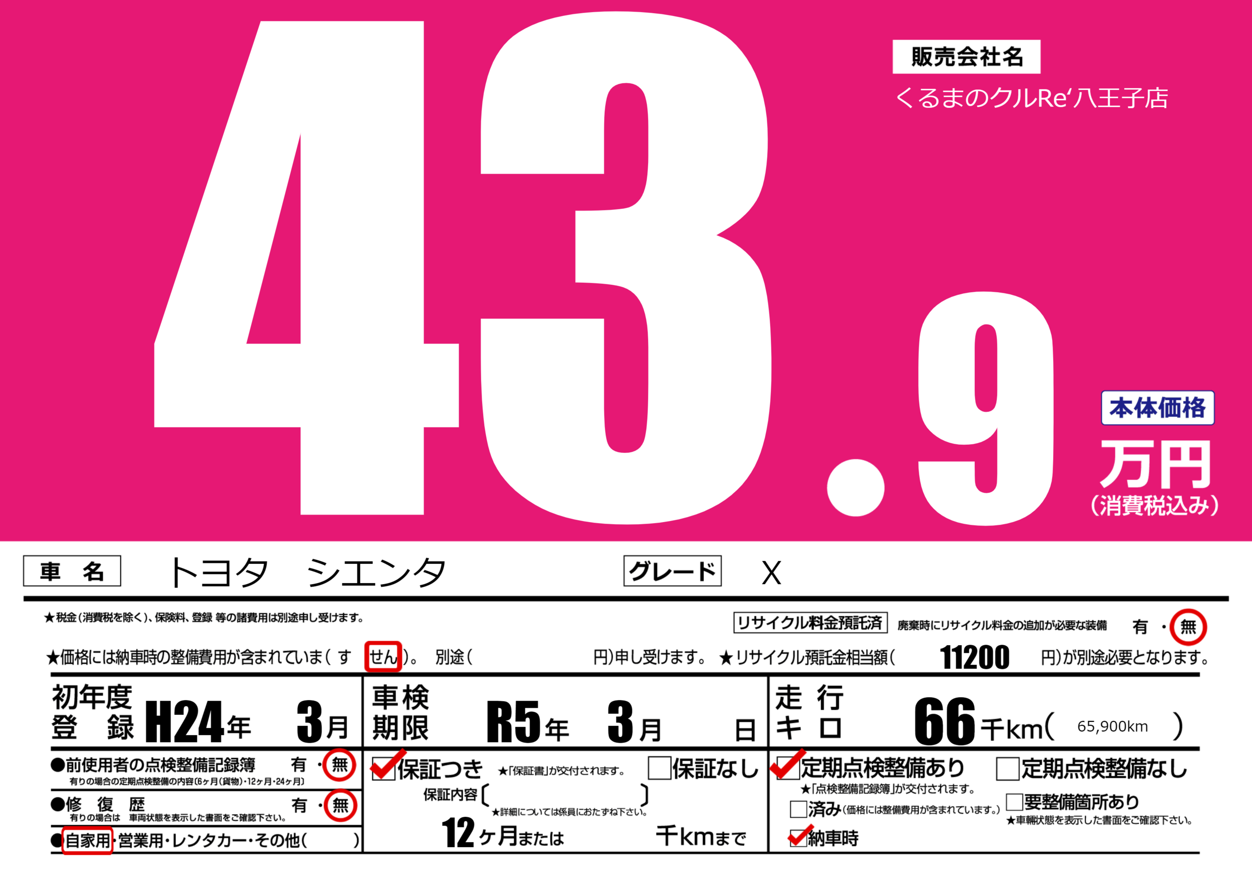 | 車名 | トヨタ シエンタ | グレード ミッション 排気量 |