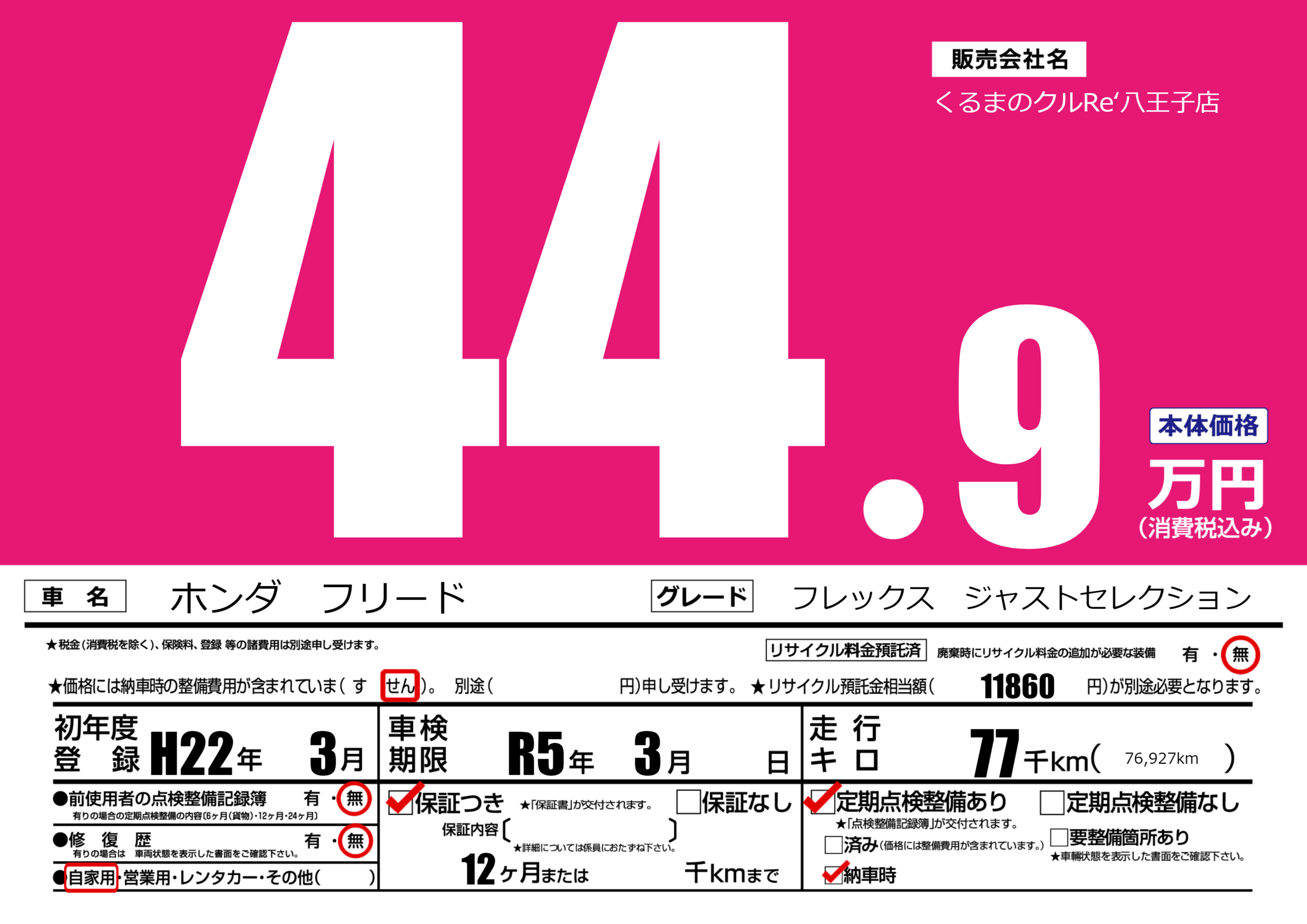 | 走行キロ | 7.7万km | 初年度登録 | H22年3月 |
