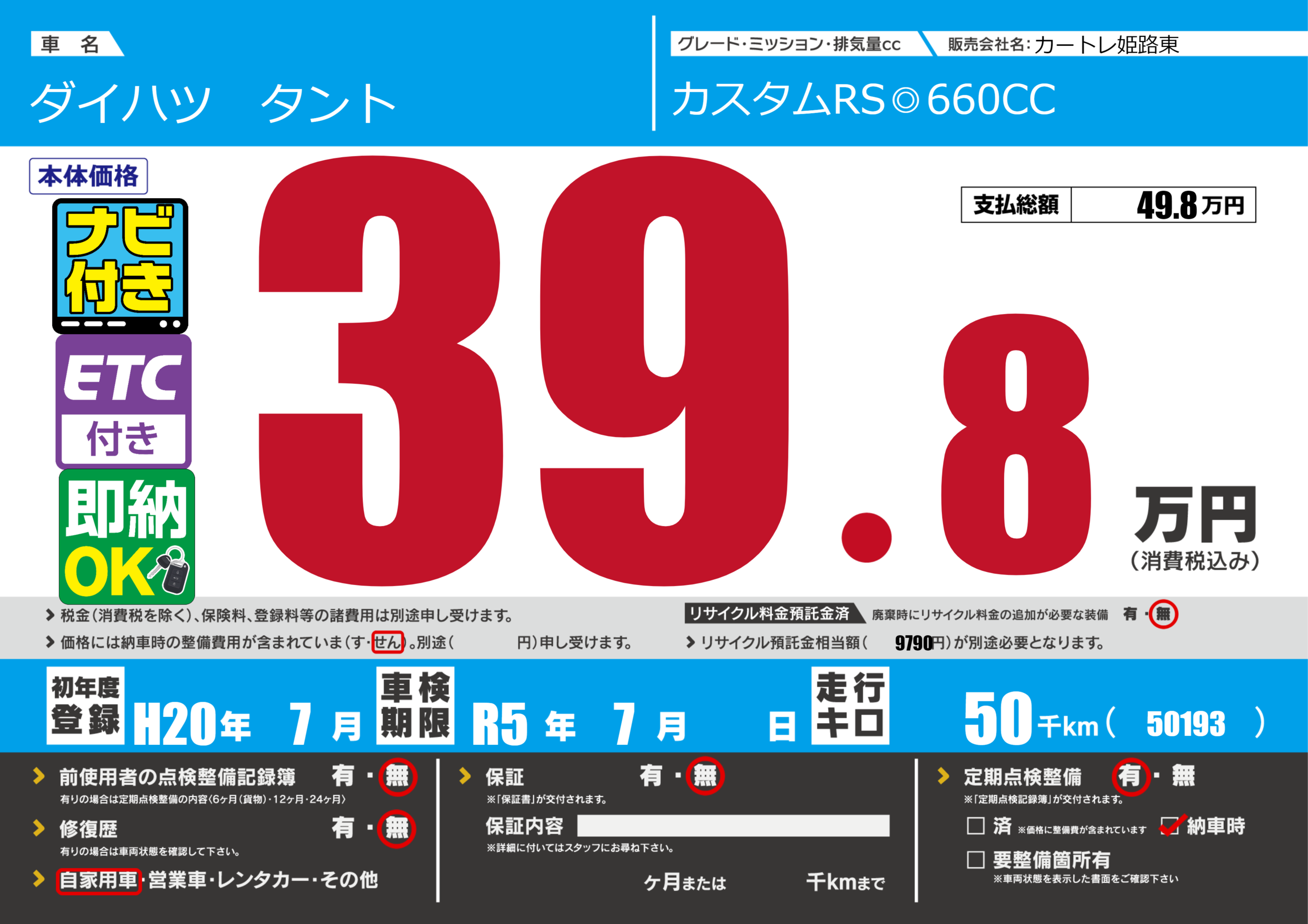 | 車名 | ダイハツ タント | グレード ミッション 排気量 |