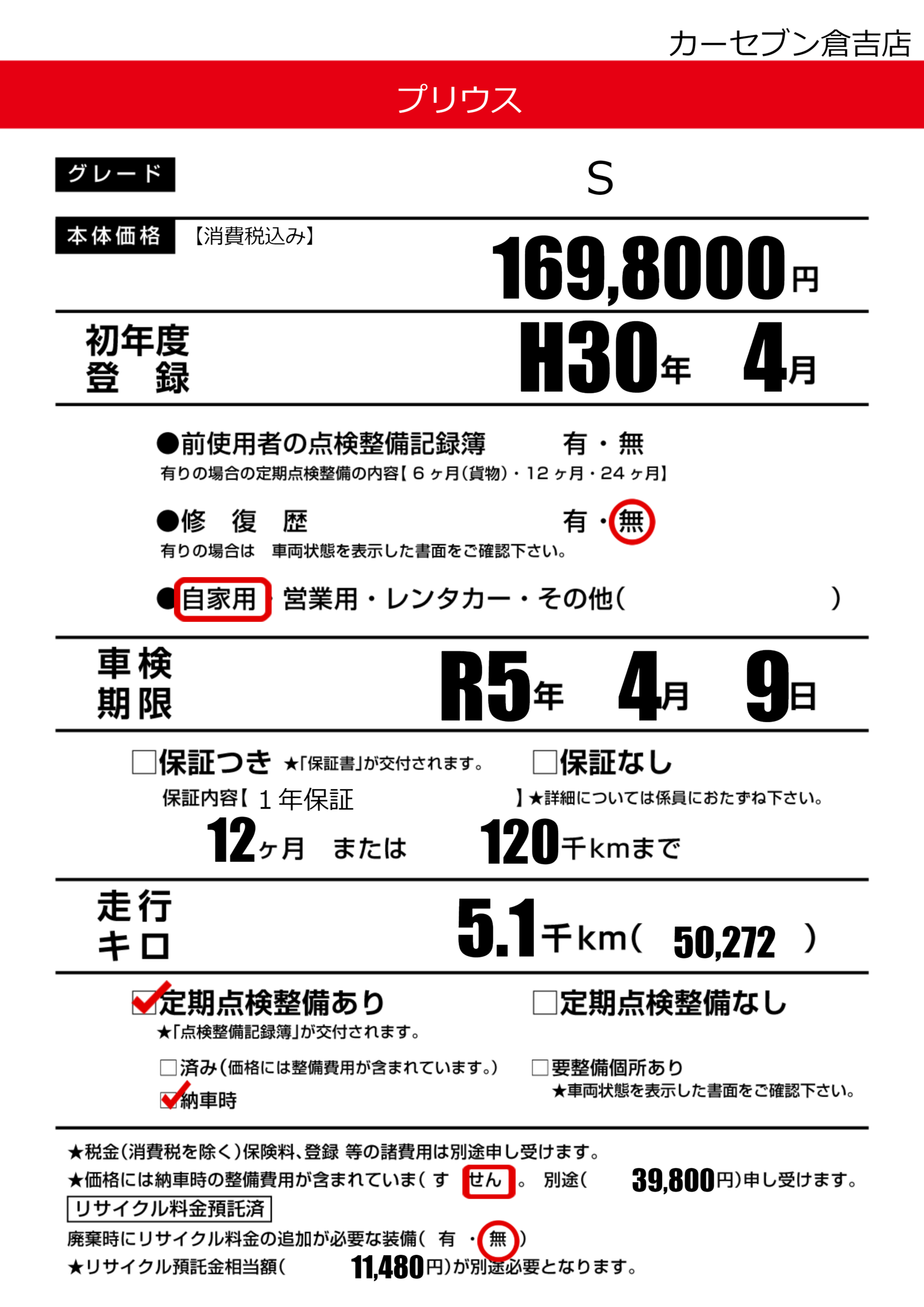 | 車名 | プリウス | グレード ミッション 排気量 |