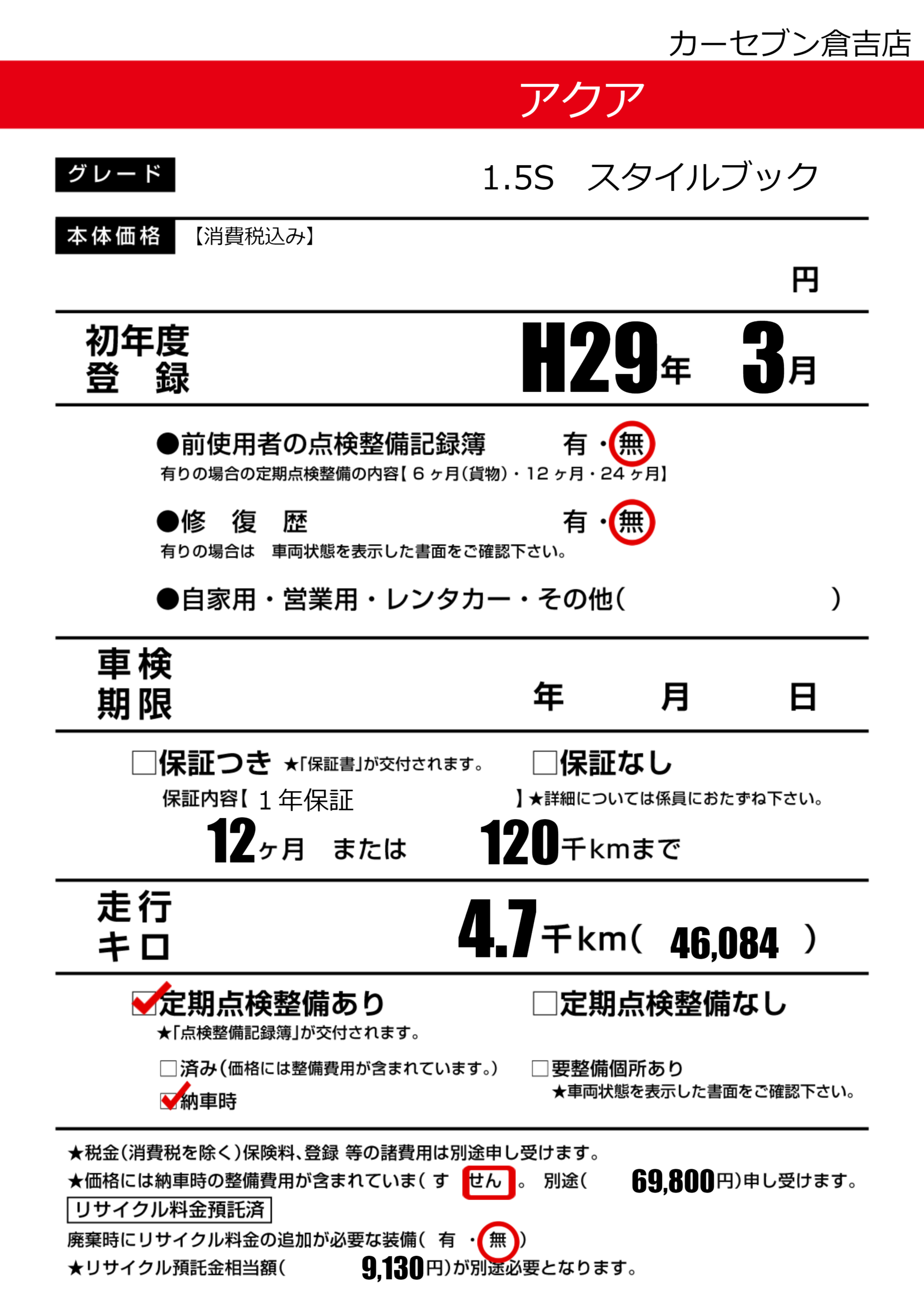 | 定期点検整備 | 定期点検整備あり 納車時あり | ||