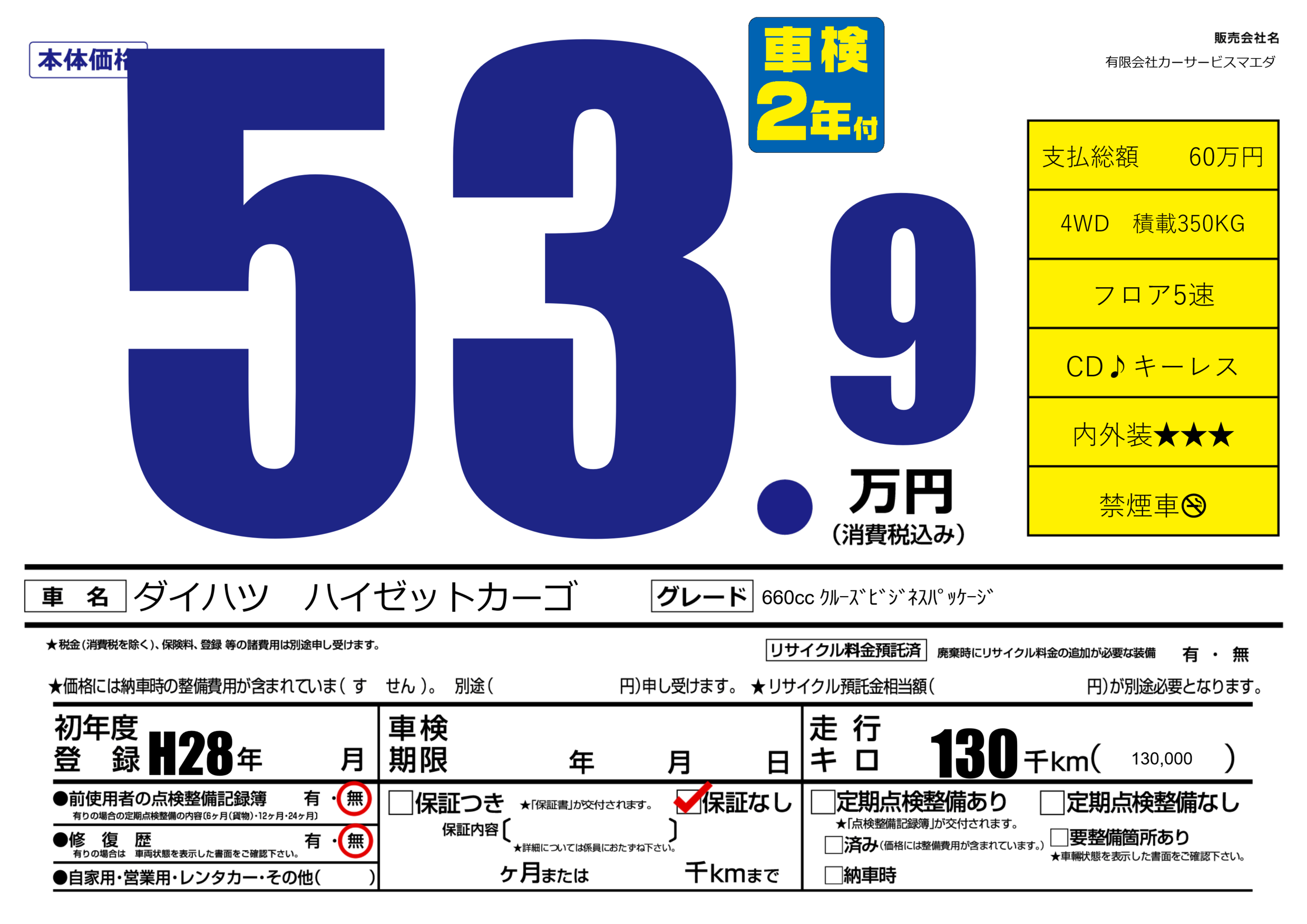| 車名 | ダイハツ ハイゼットカーゴ | グレード ミッション 排気量 |