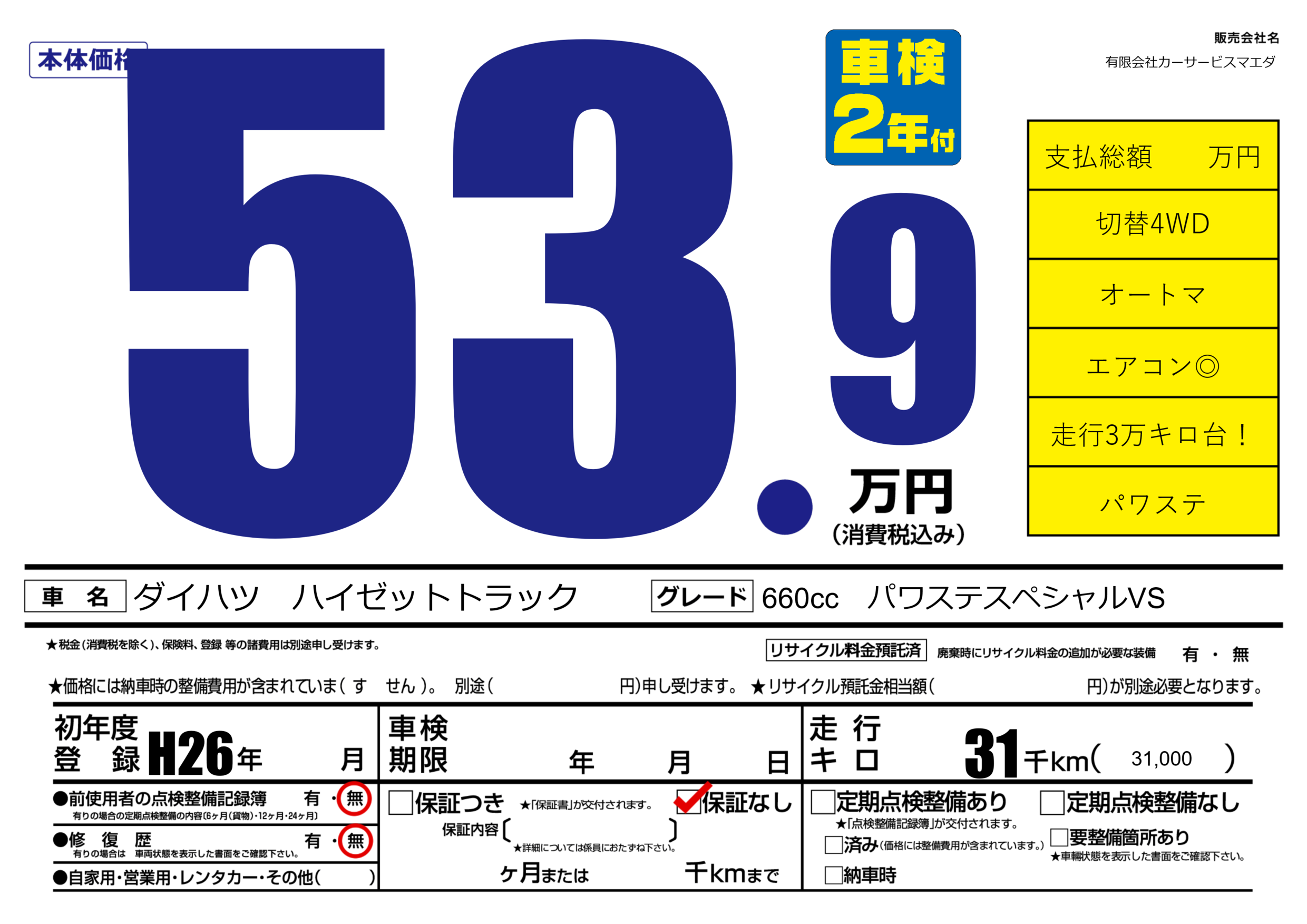 | 走行キロ | 3.1万km | 初年度登録 | H26年---月 |