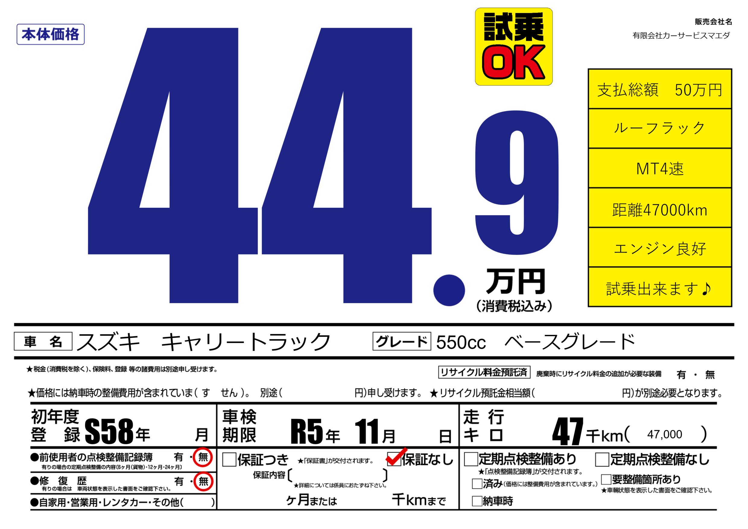 | 車名 | スズキ キャリートラック | グレード ミッション 排気量 |