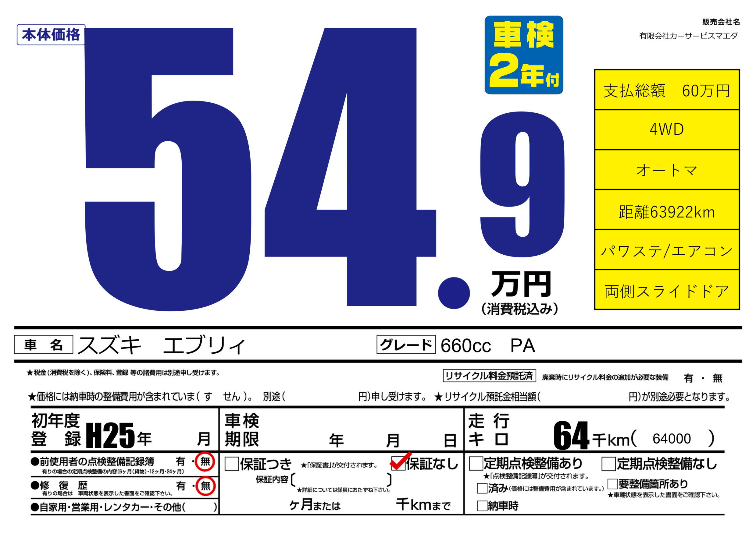 | 車名 | スズキ エブリィ | グレード ミッション 排気量 |