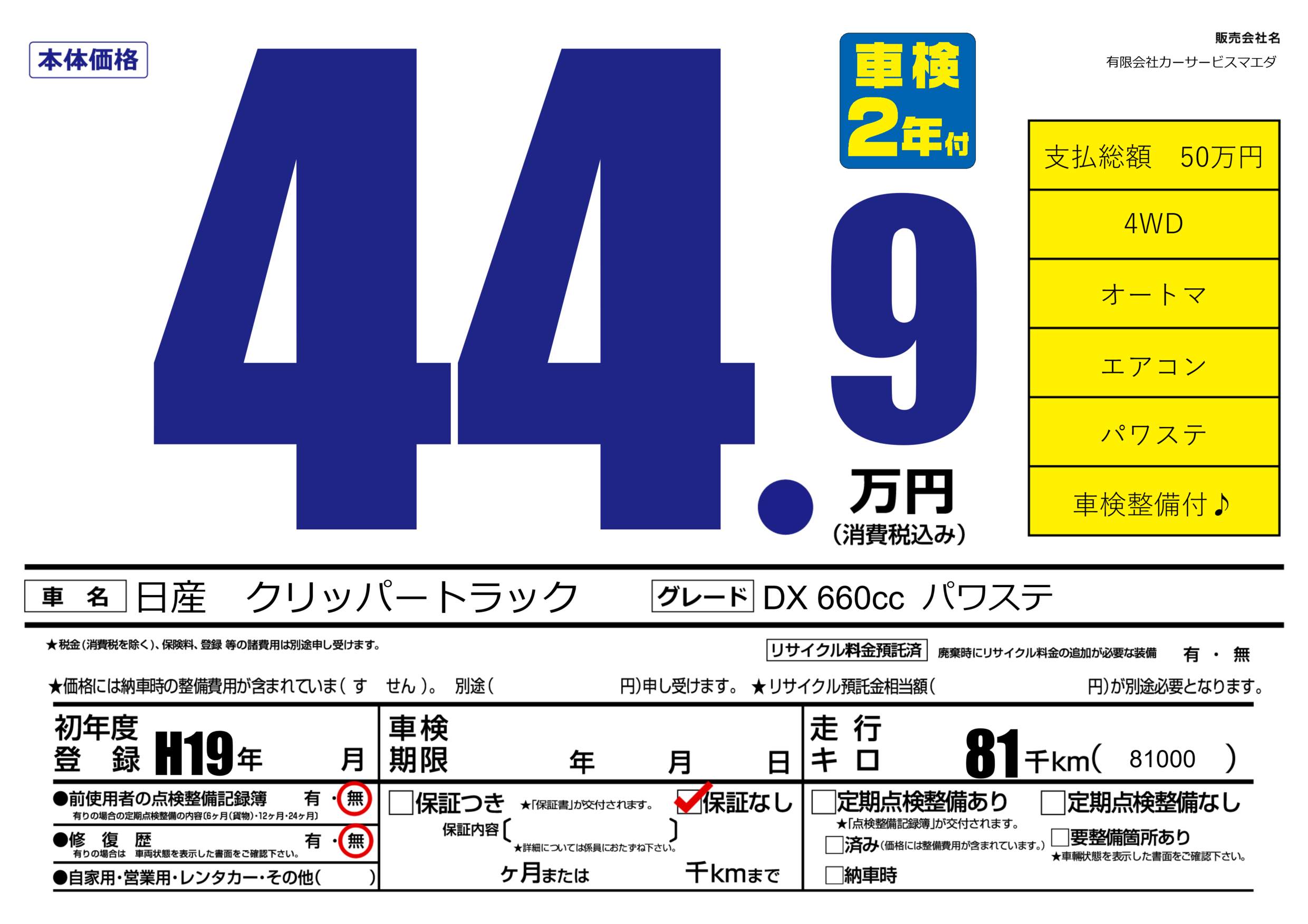 | 車名 | 日産 クリッパートラック | グレード ミッション 排気量 |
