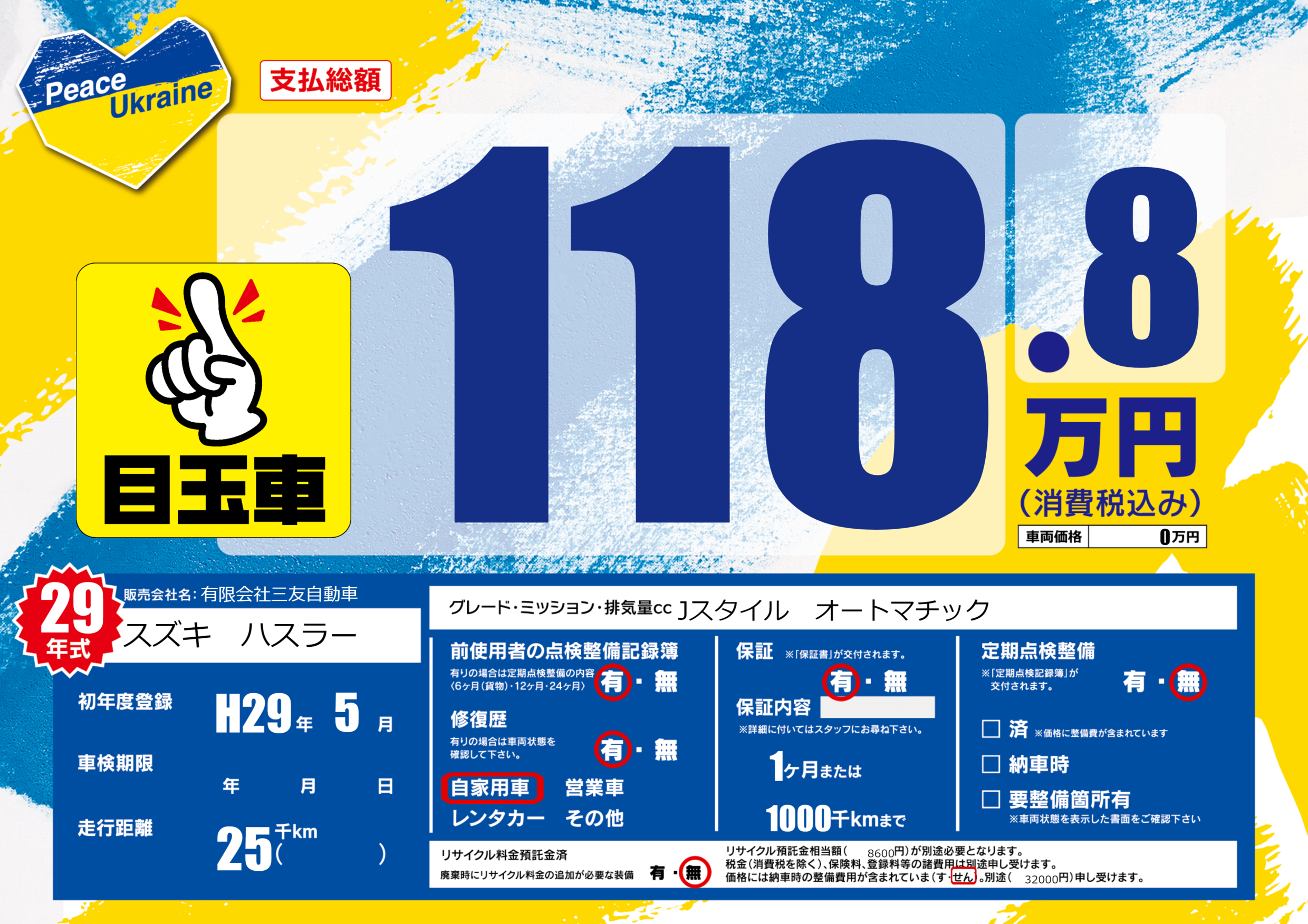 | 車名 | スズキ ハスラー | グレード ミッション 排気量 |
