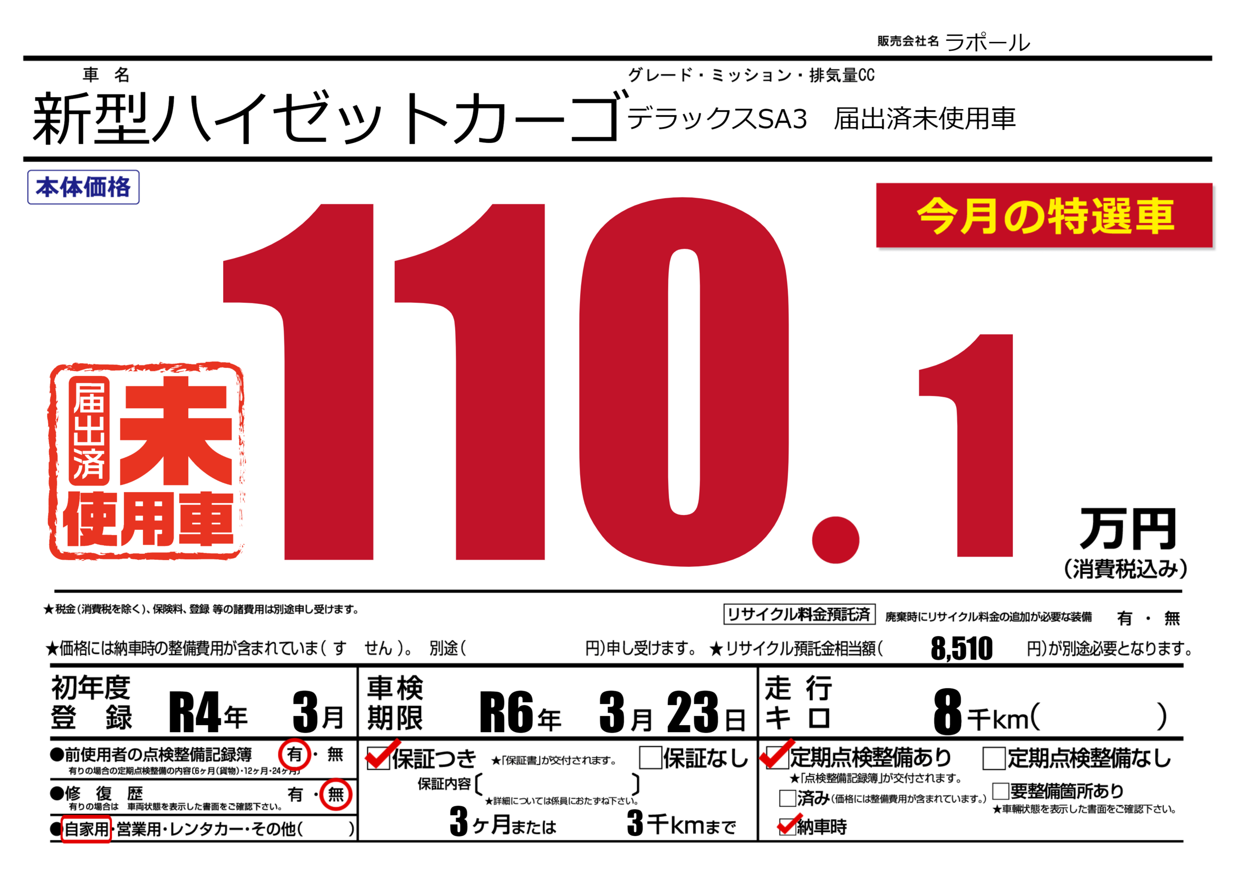 | 車名 | 新型ハイゼットカーゴ | グレード ミッション 排気量 |