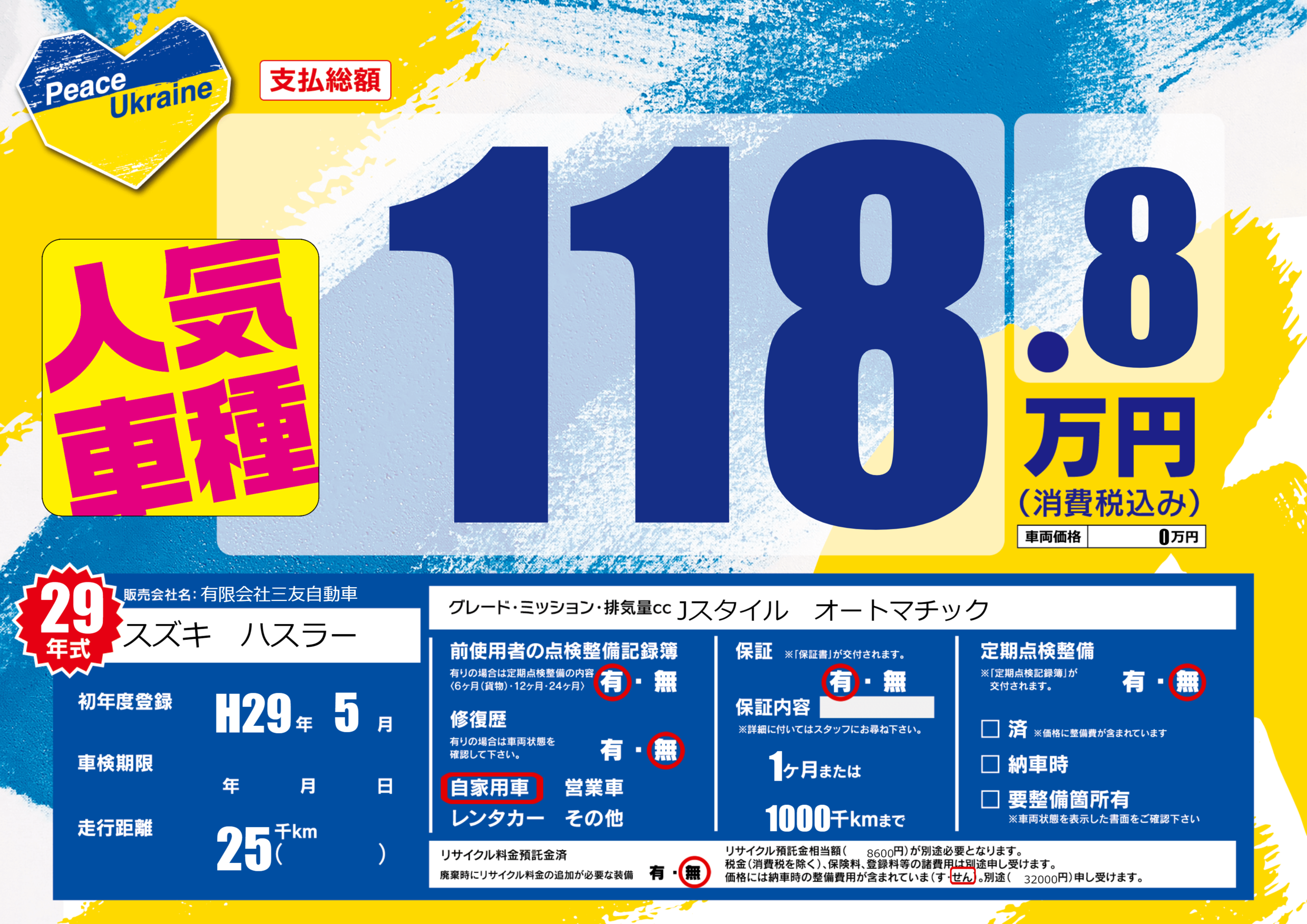 | 車名 | スズキ ハスラー | グレード ミッション 排気量 |