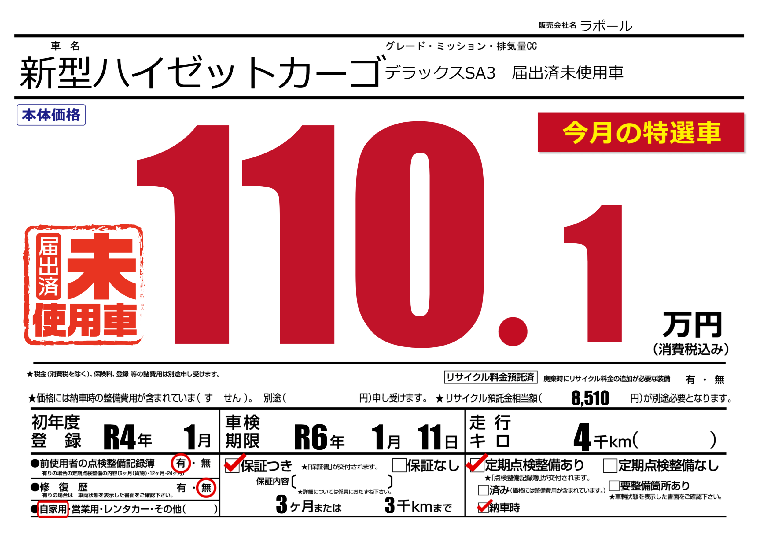 保証付き 保証内容(---) 3ヶ月または(3)千kmまで |