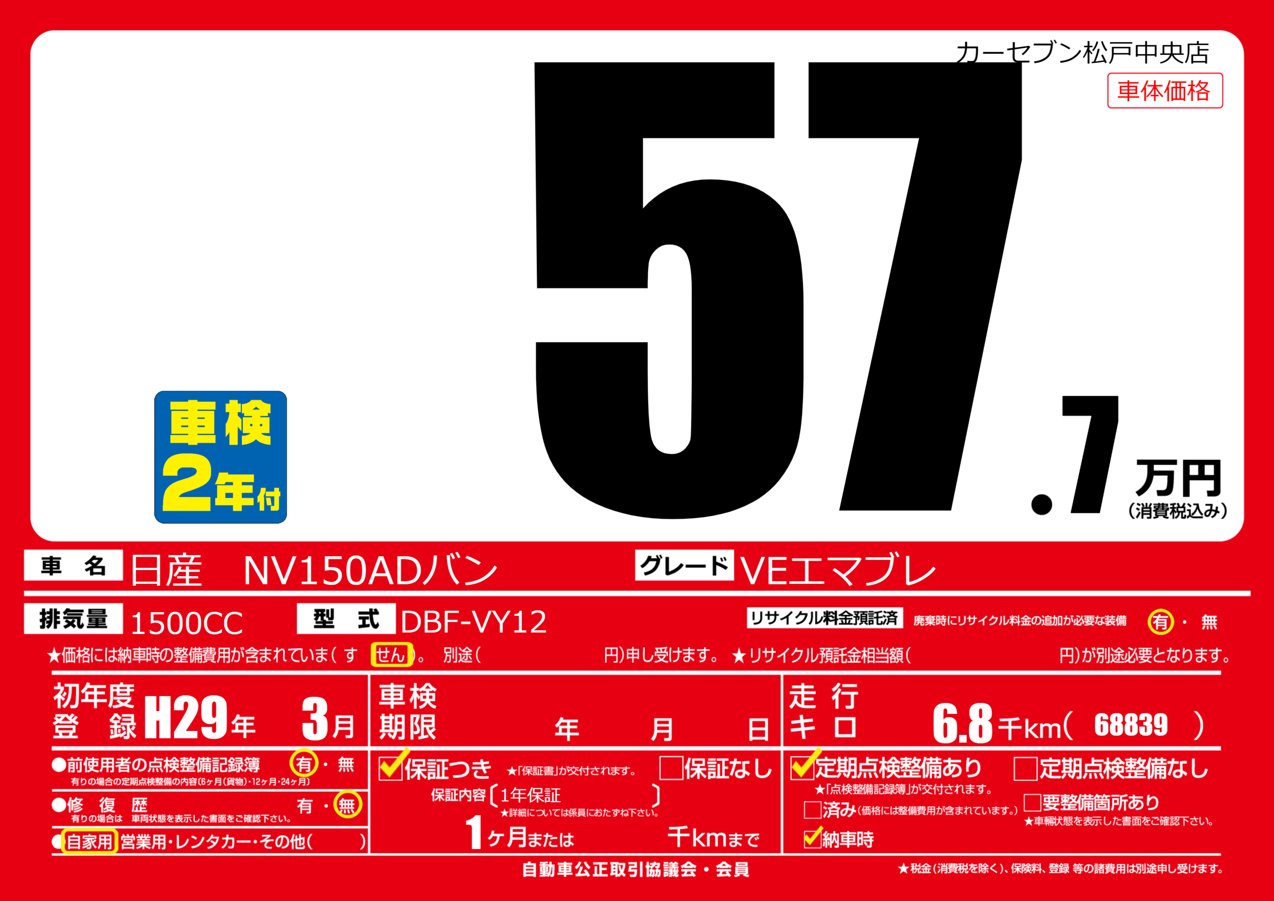 | 車名 | 日産 NV150ADバン | グレード ミッション 排気量 |