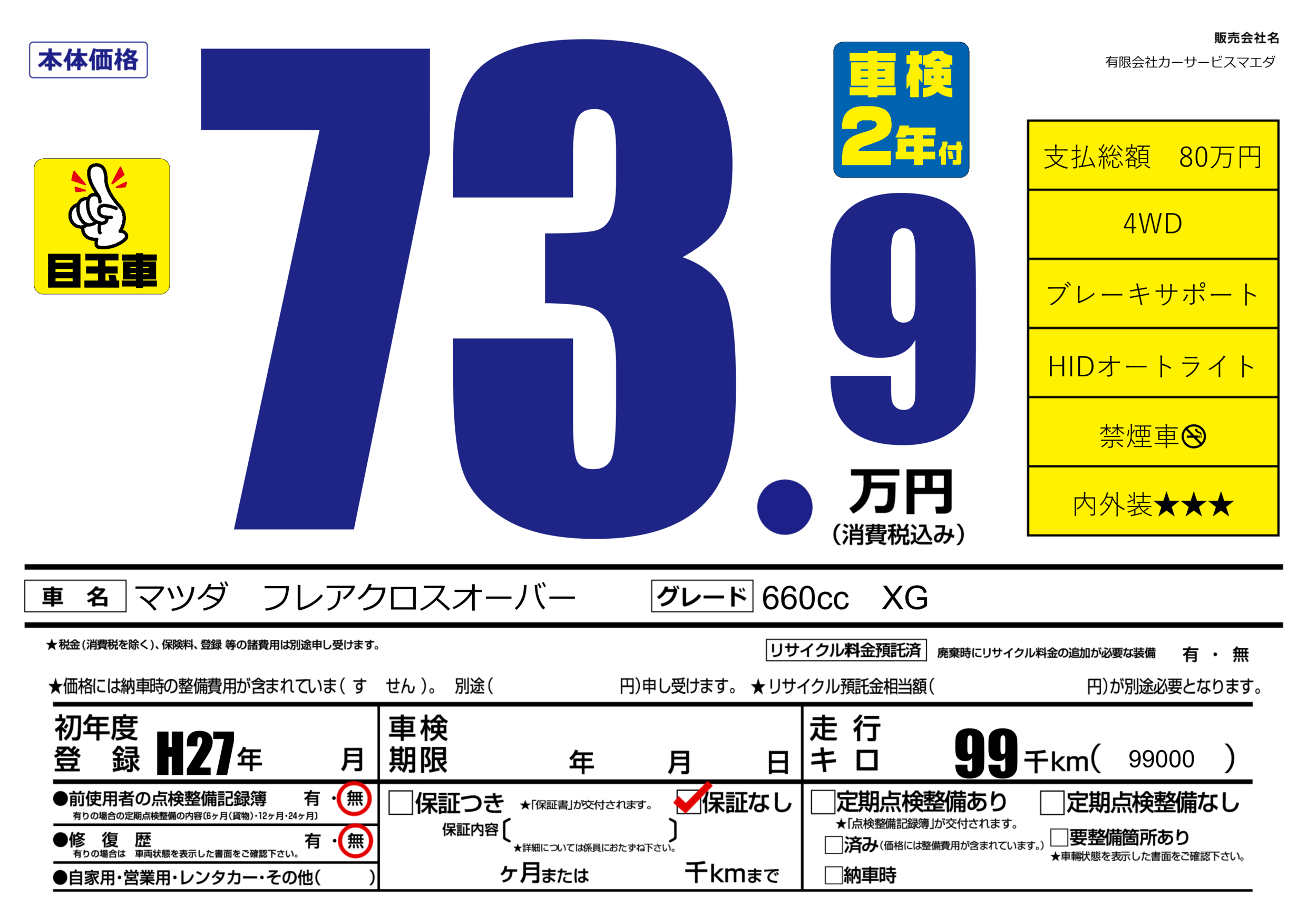 | 走行キロ | 9.9万km | 初年度登録 | H27年---月 |