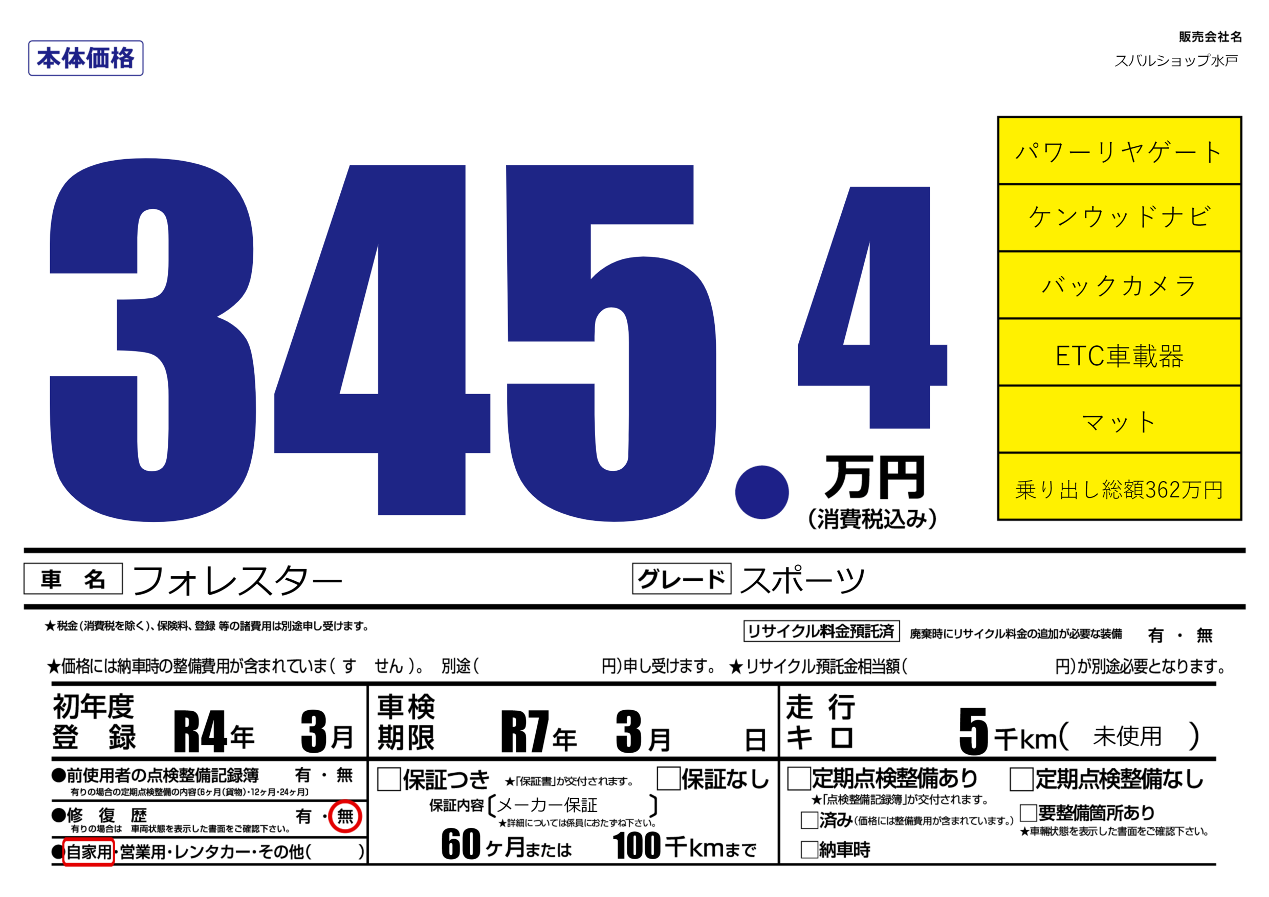 | 車名 | フォレスター | グレード ミッション 排気量 |