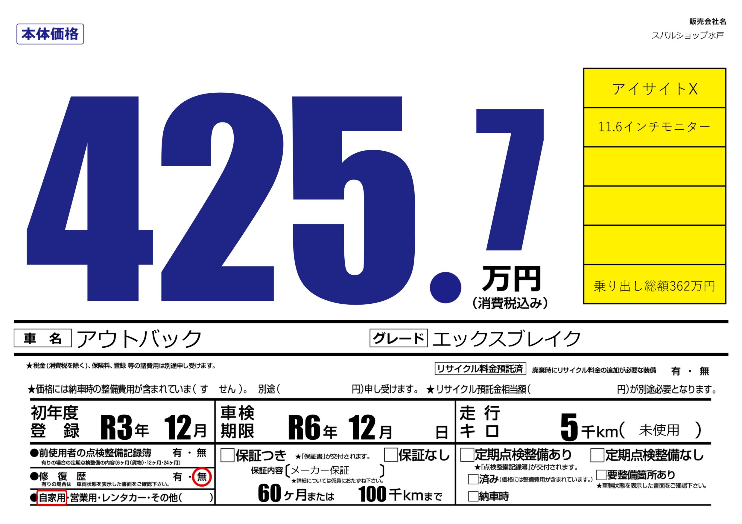 | 車名 | アウトバック | グレード ミッション 排気量 |