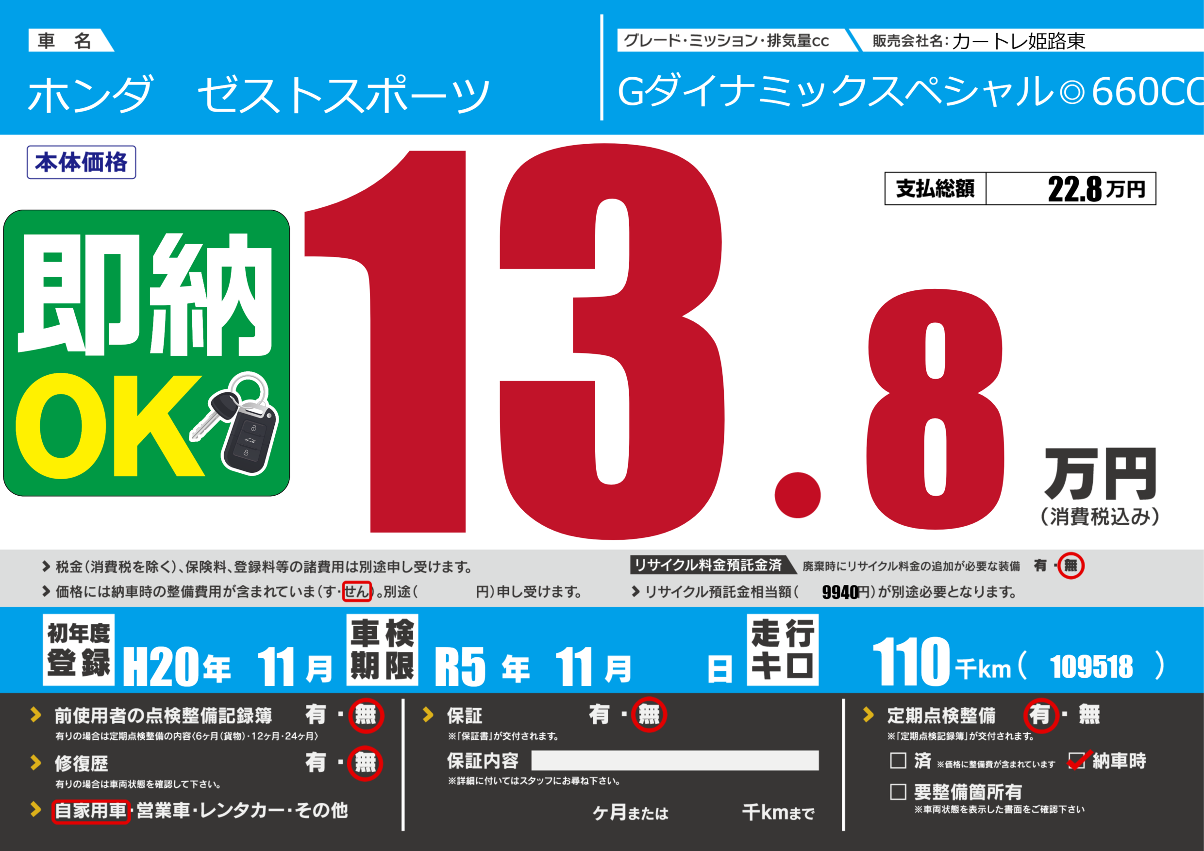 | 走行キロ | 11万km | 初年度登録 | H20年11月 |