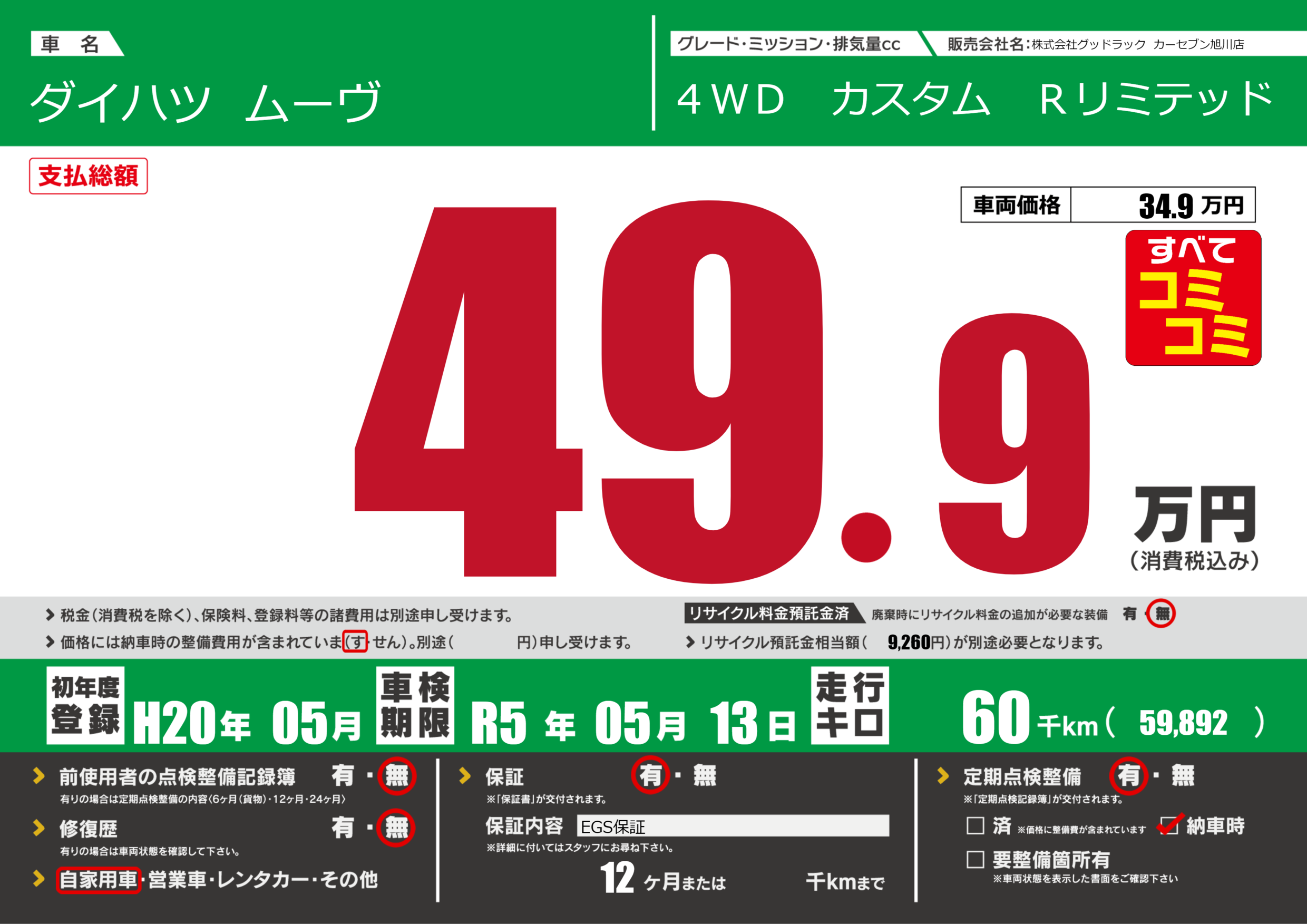 | 走行キロ | 6万km | 初年度登録 | H20年05月 |