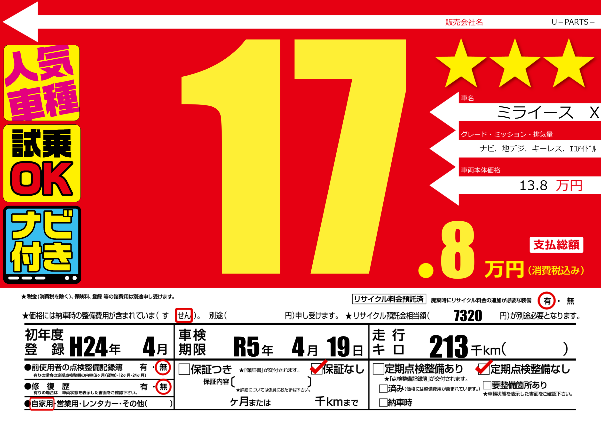 | 車名 | ミライース X | グレード ミッション 排気量 |