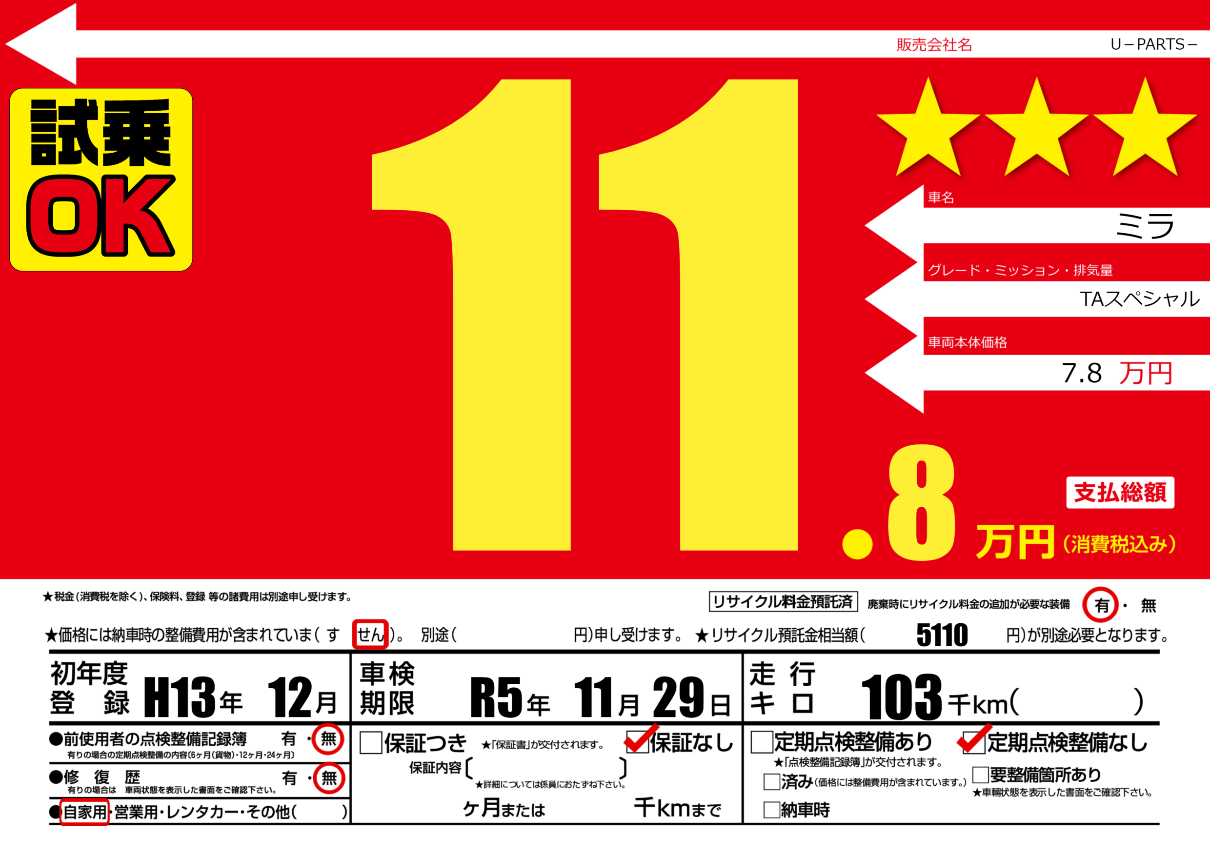 あり | リサイクル預託金相当額 | ( 1円)が別途必要 |