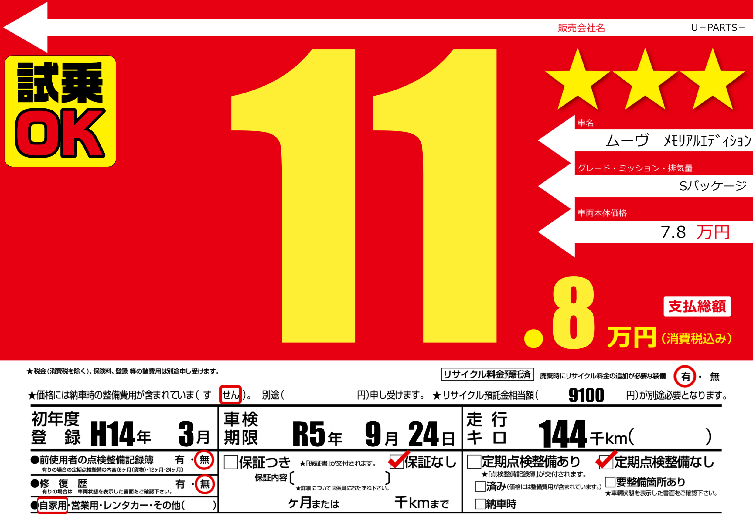 | 走行キロ | 14.4万km | 初年度登録 | H14年3月 |
