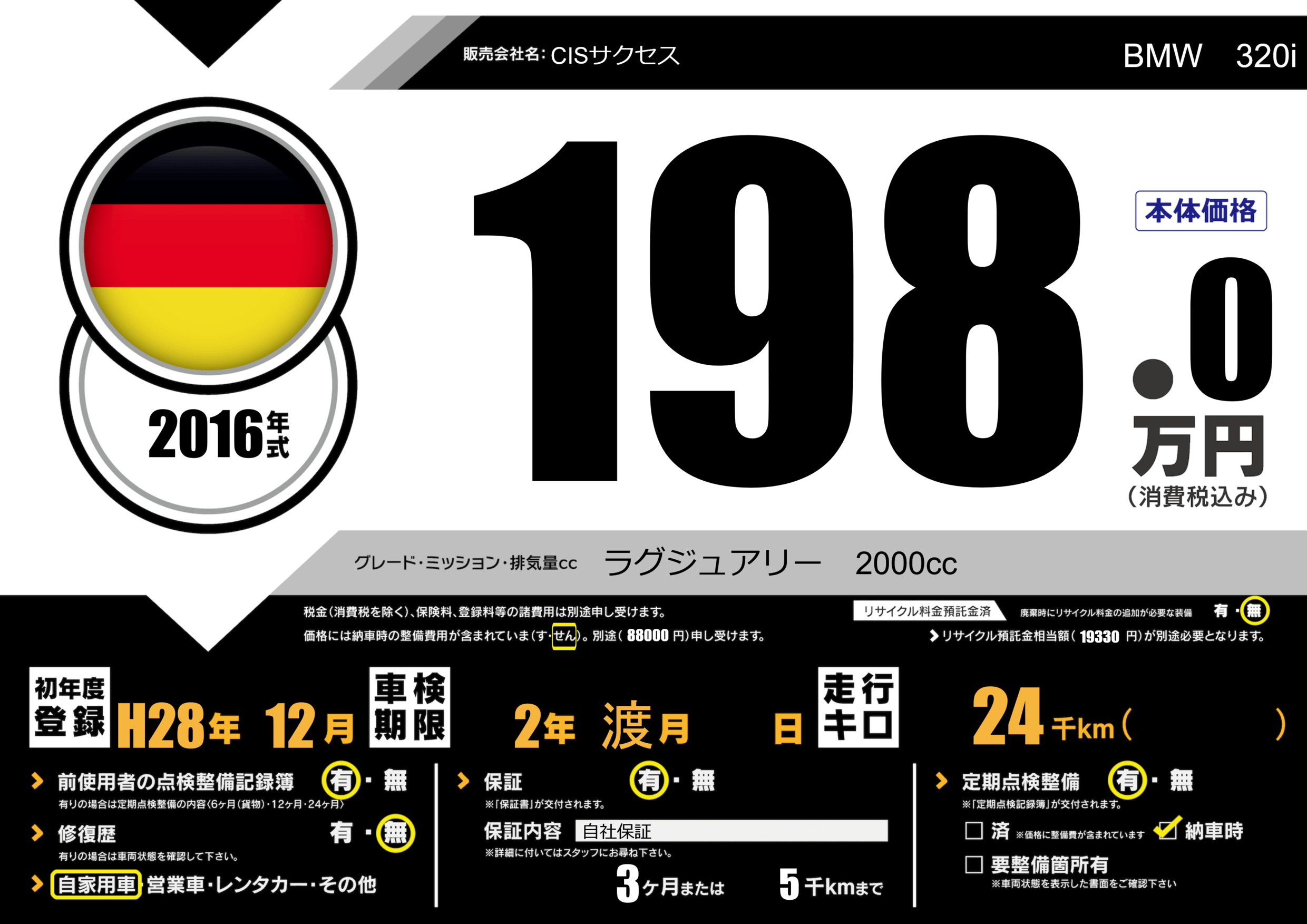 | 車名 | BMW 320i | グレード ミッション 排気量 |