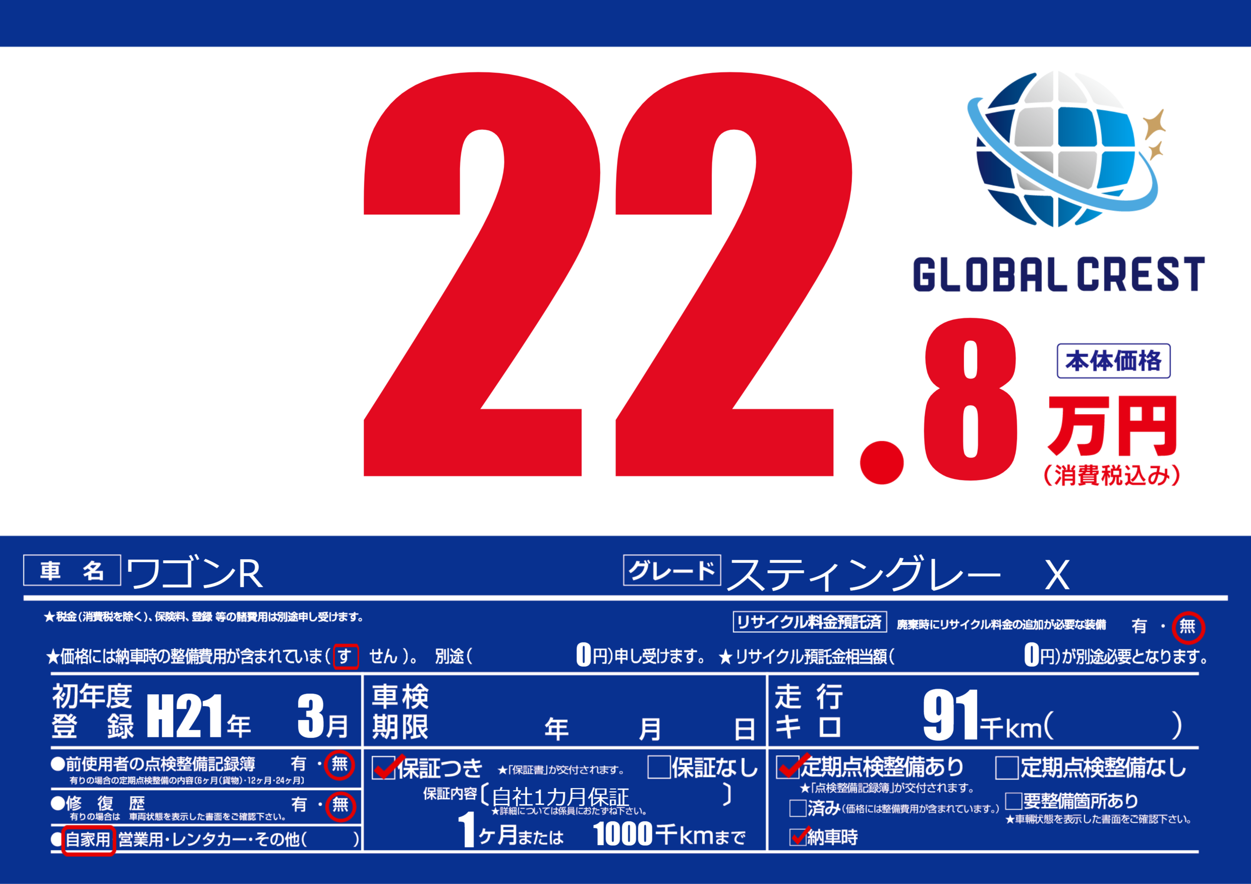 | 走行キロ | 9.1万km | 初年度登録 | H21年3月 |