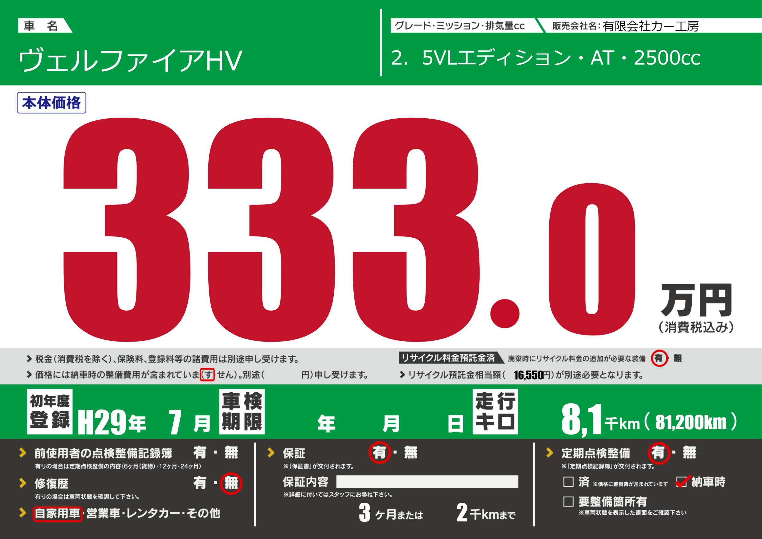 | 車名 | ヴェルファイアHV | グレード ミッション 排気量 |