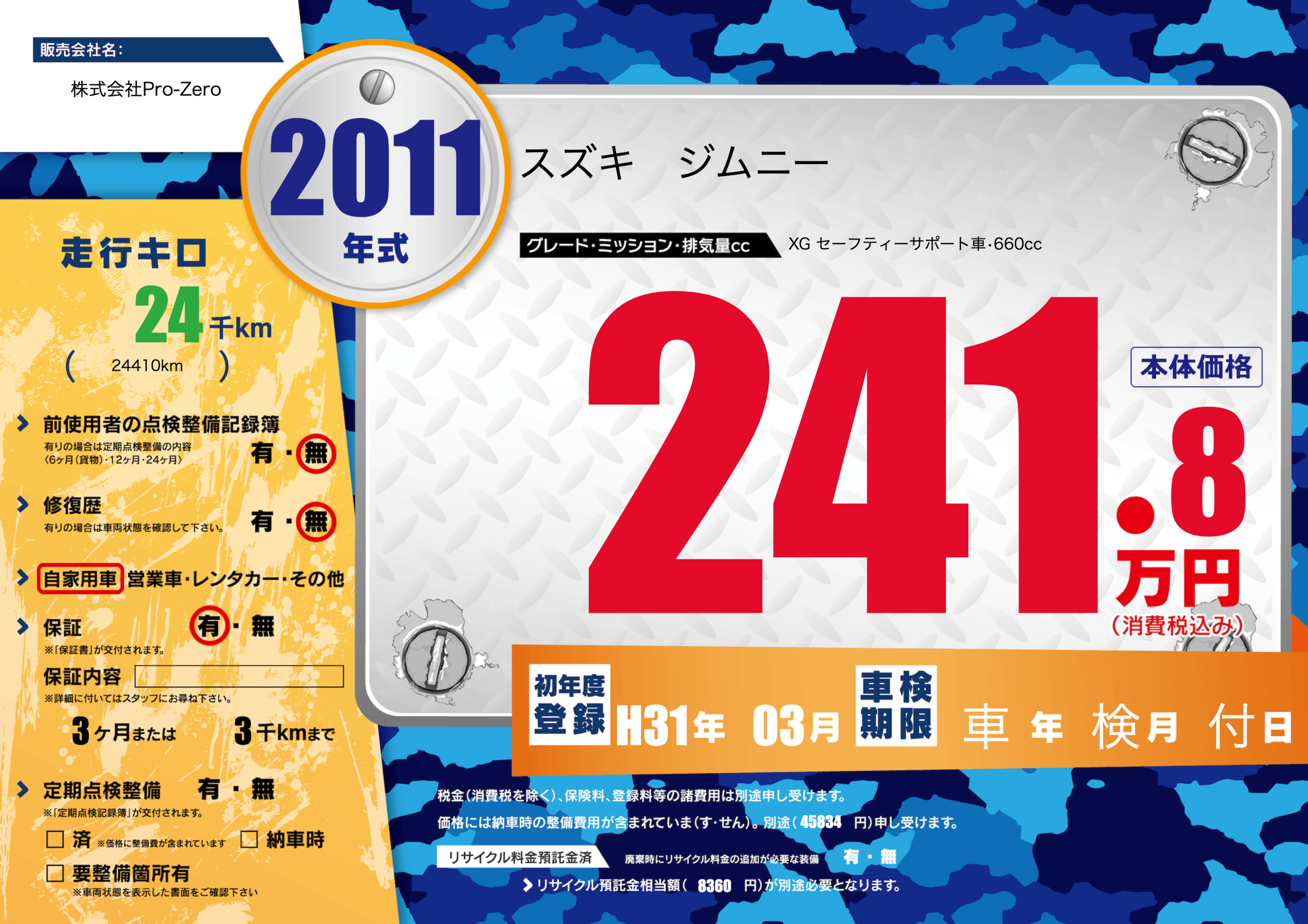 | 車名 | スズキ ジムニー | グレード ミッション 排気量 |