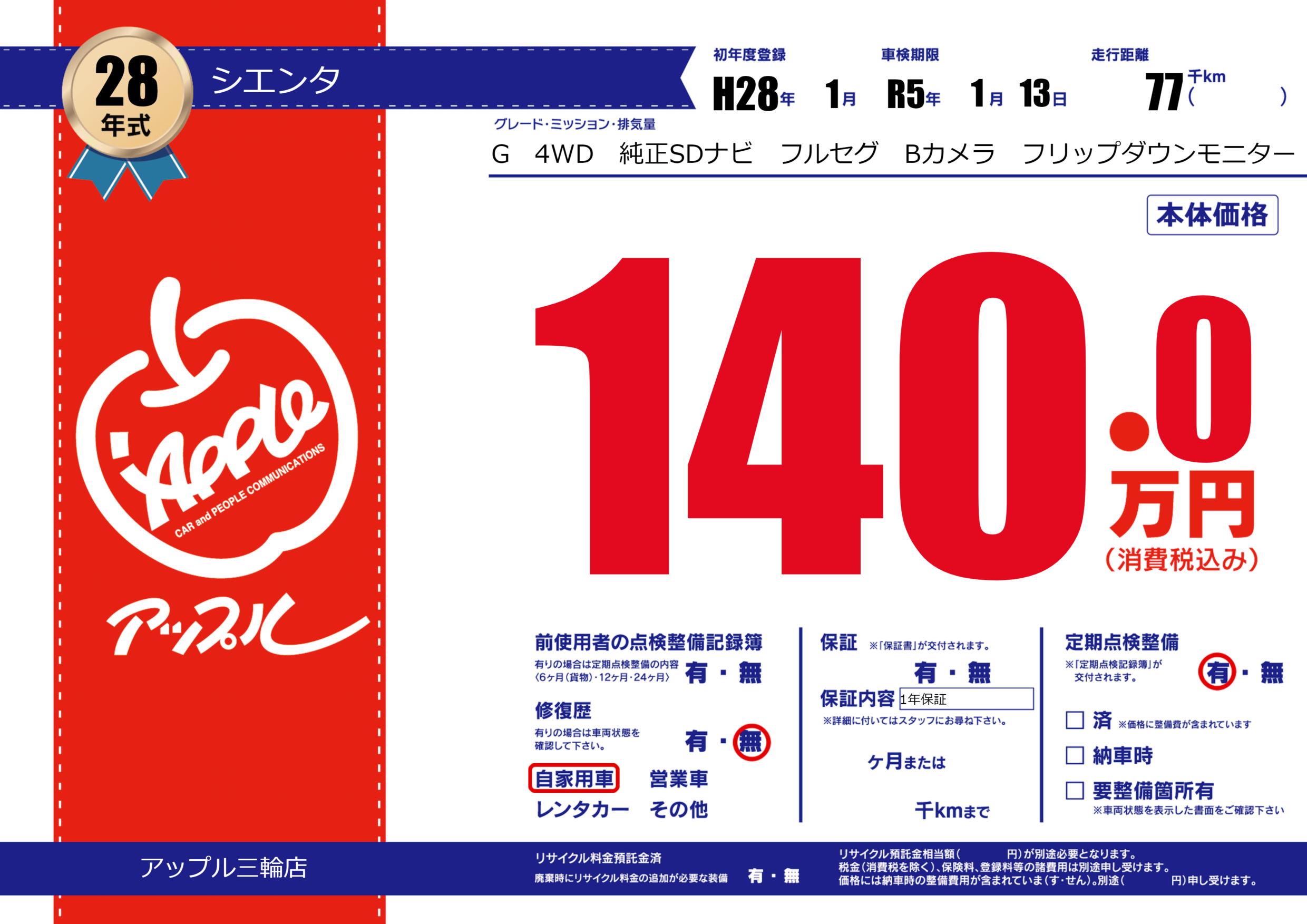 | 車名 | シエンタ | グレード ミッション 排気量 |