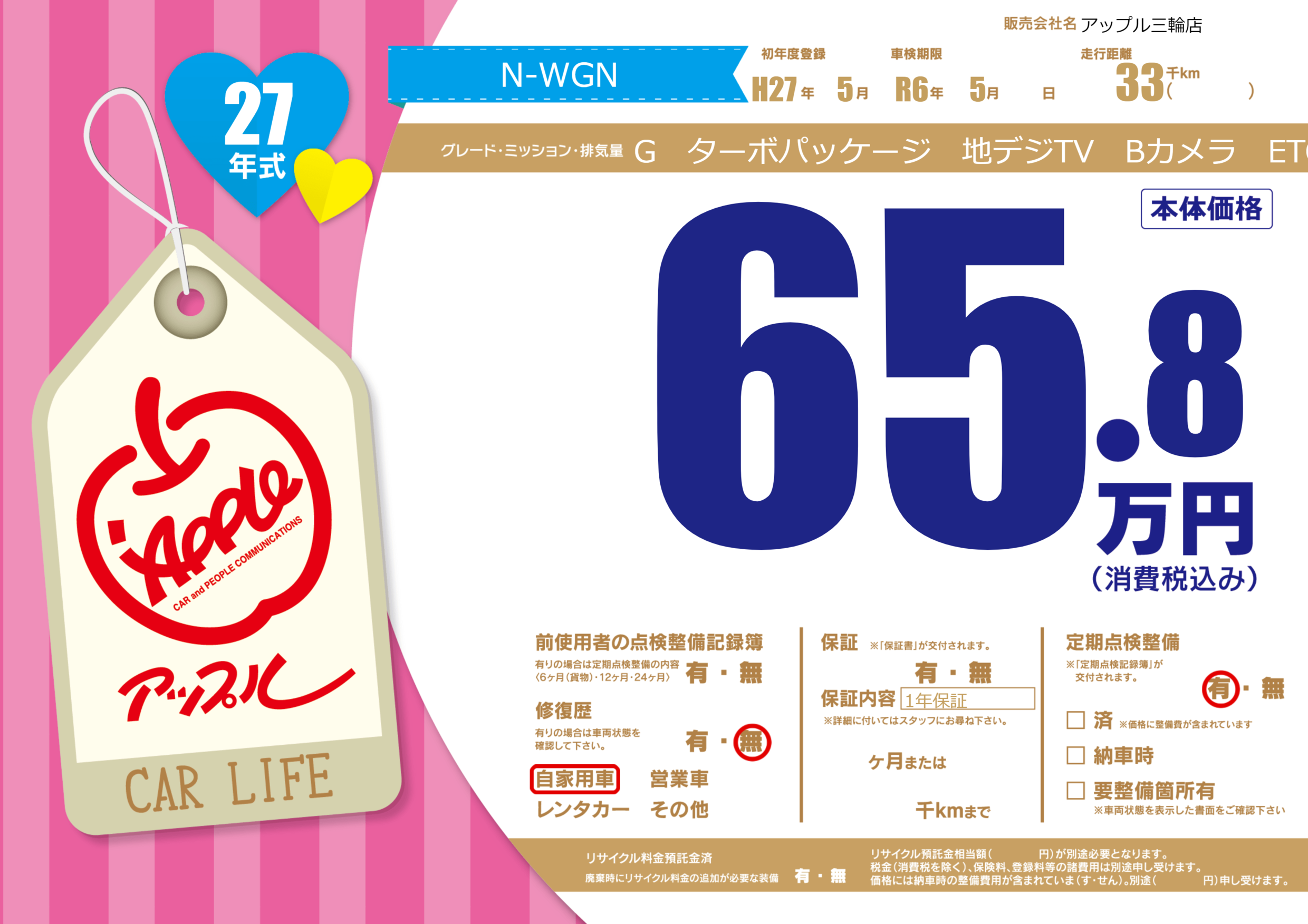 | 走行キロ | 3.3万km | 初年度登録 | H27年5月 |