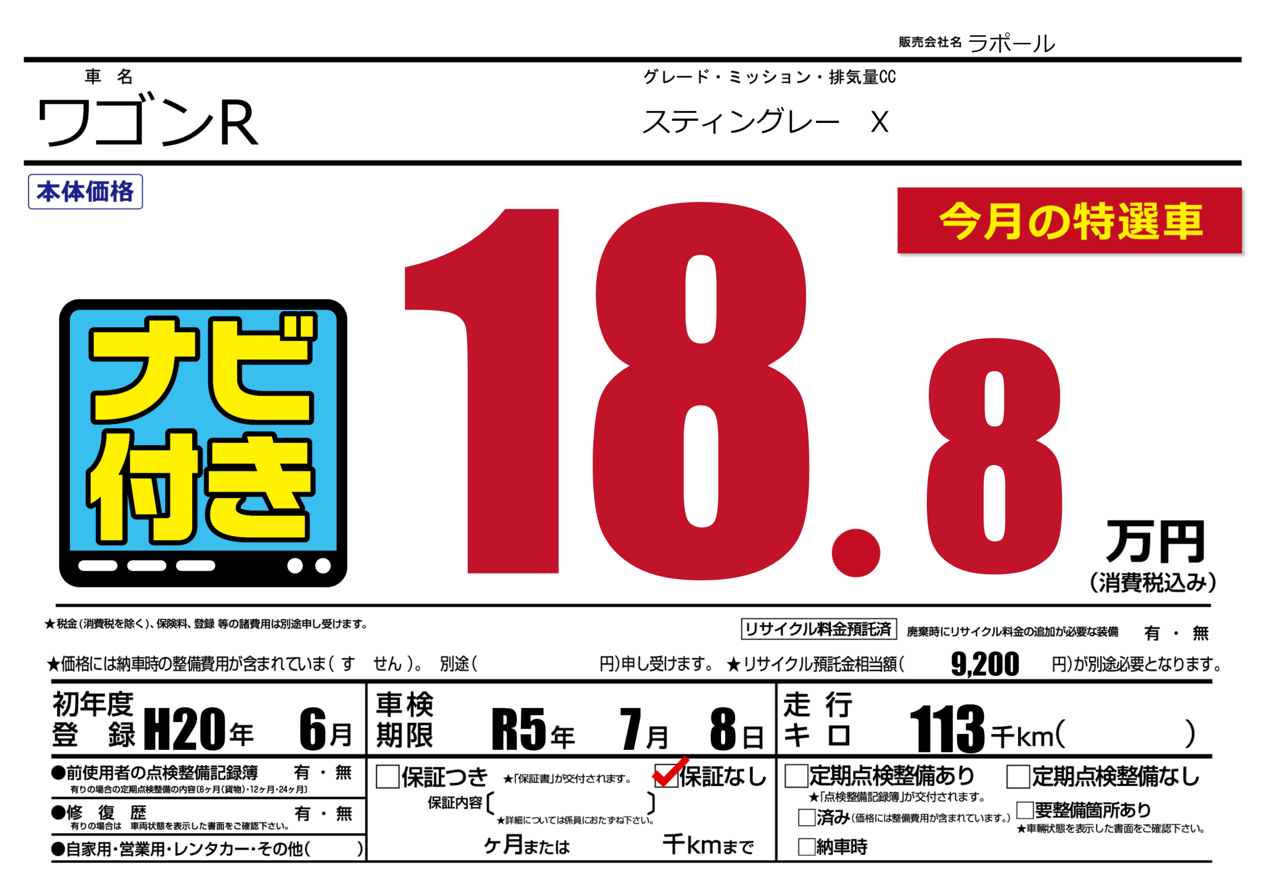 | 車名 | ワゴンR | グレード ミッション 排気量 |