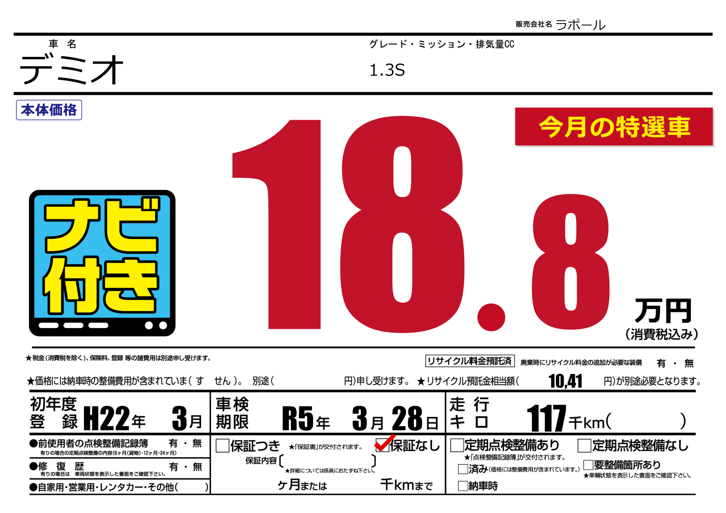 | 車名 | デミオ | グレード ミッション 排気量 |