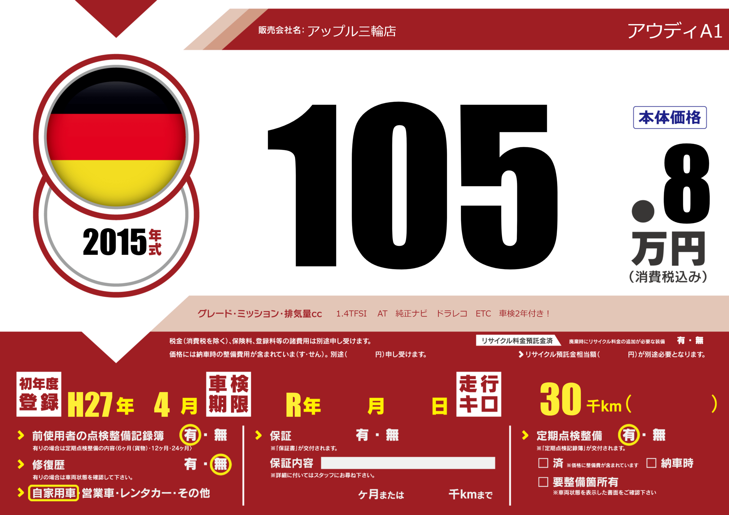 | 車名 | アウディA1 | グレード ミッション 排気量 |
