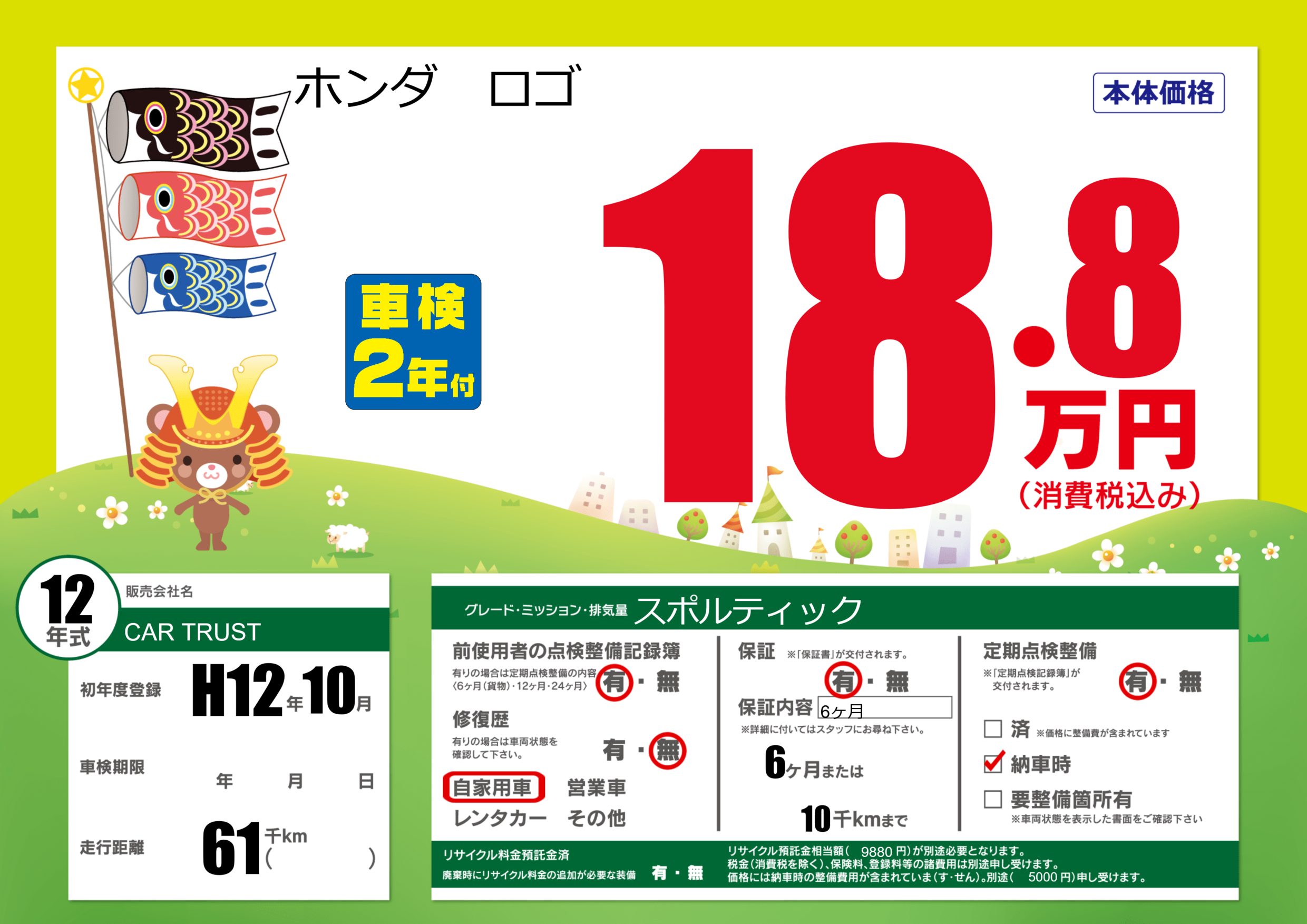 | 走行キロ | 6.1万km | 初年度登録 | H12年10月 |