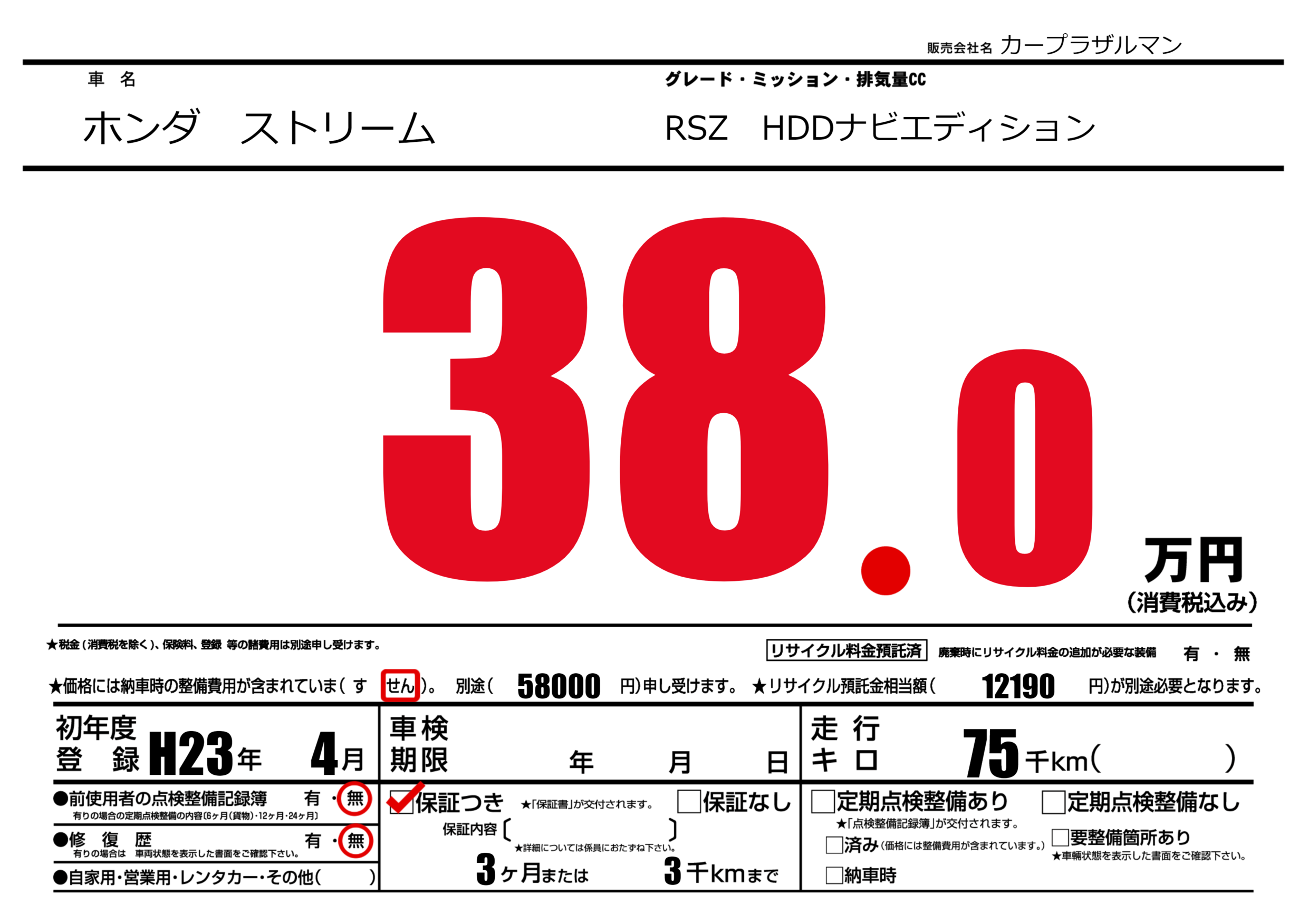 | 車名 | ホンダ ストリーム | グレード ミッション 排気量 |