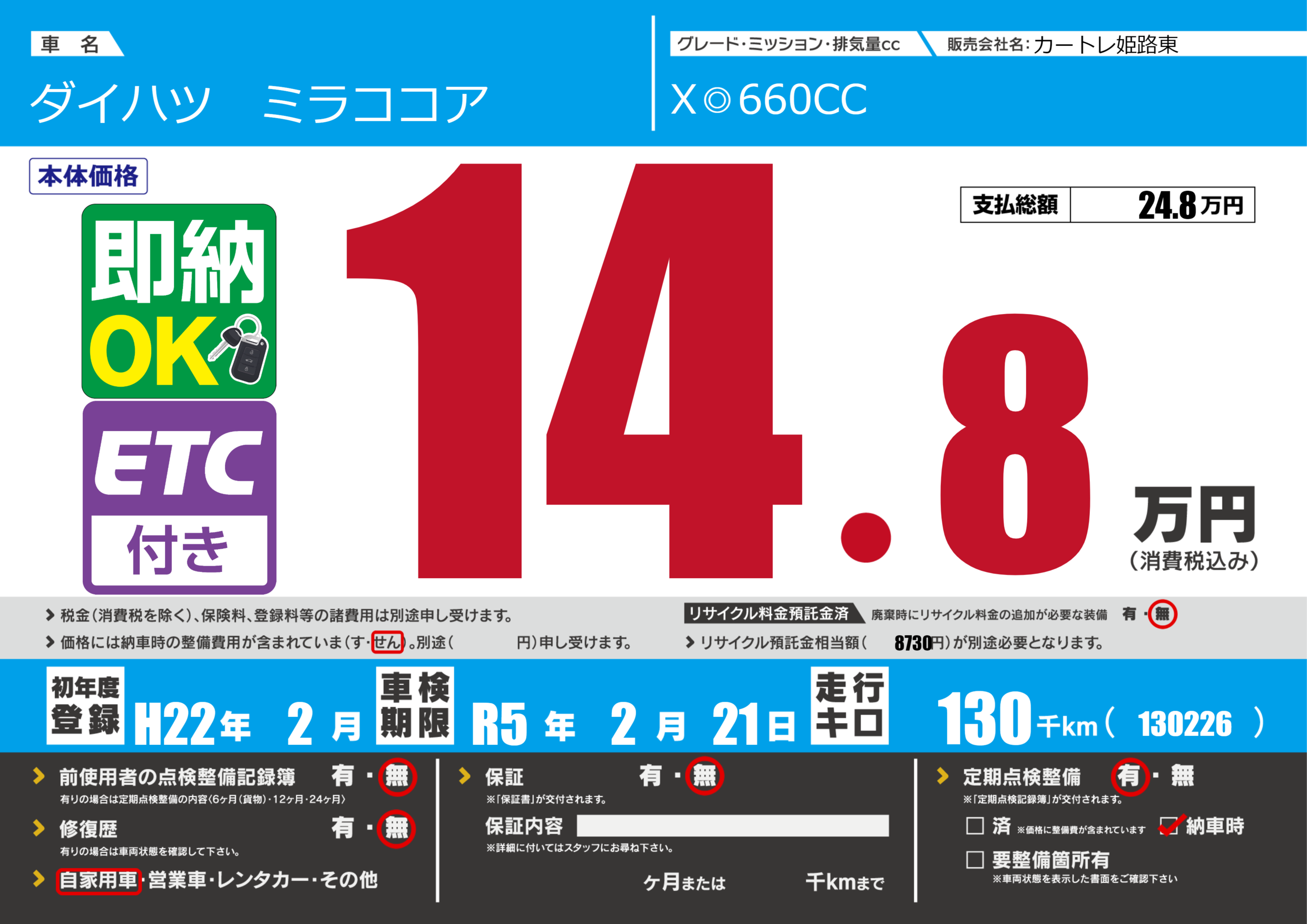 | 定期点検整備 | 定期点検整備あり 納車時あり | ||