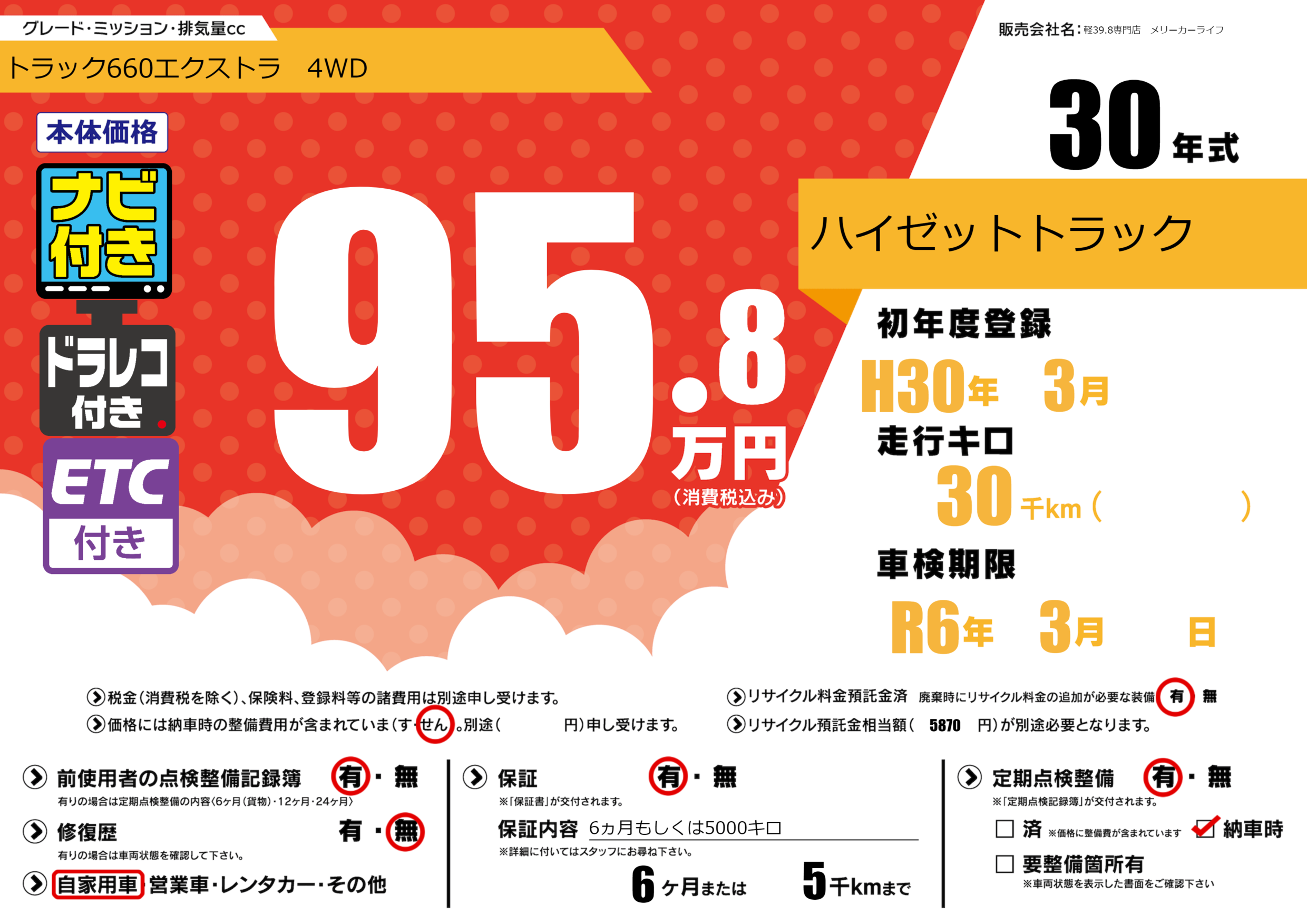 | 車名 | ハイゼットトラック | グレード ミッション 排気量 |