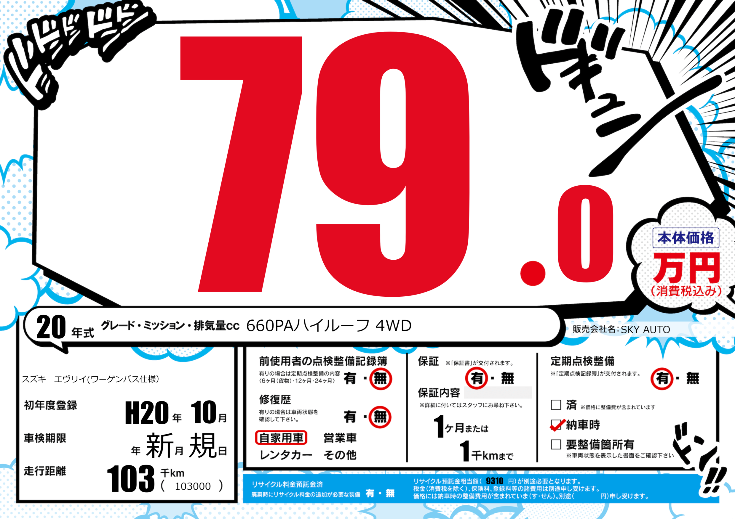 | 走行キロ | 10.3万km | 初年度登録 | H20年10月 |