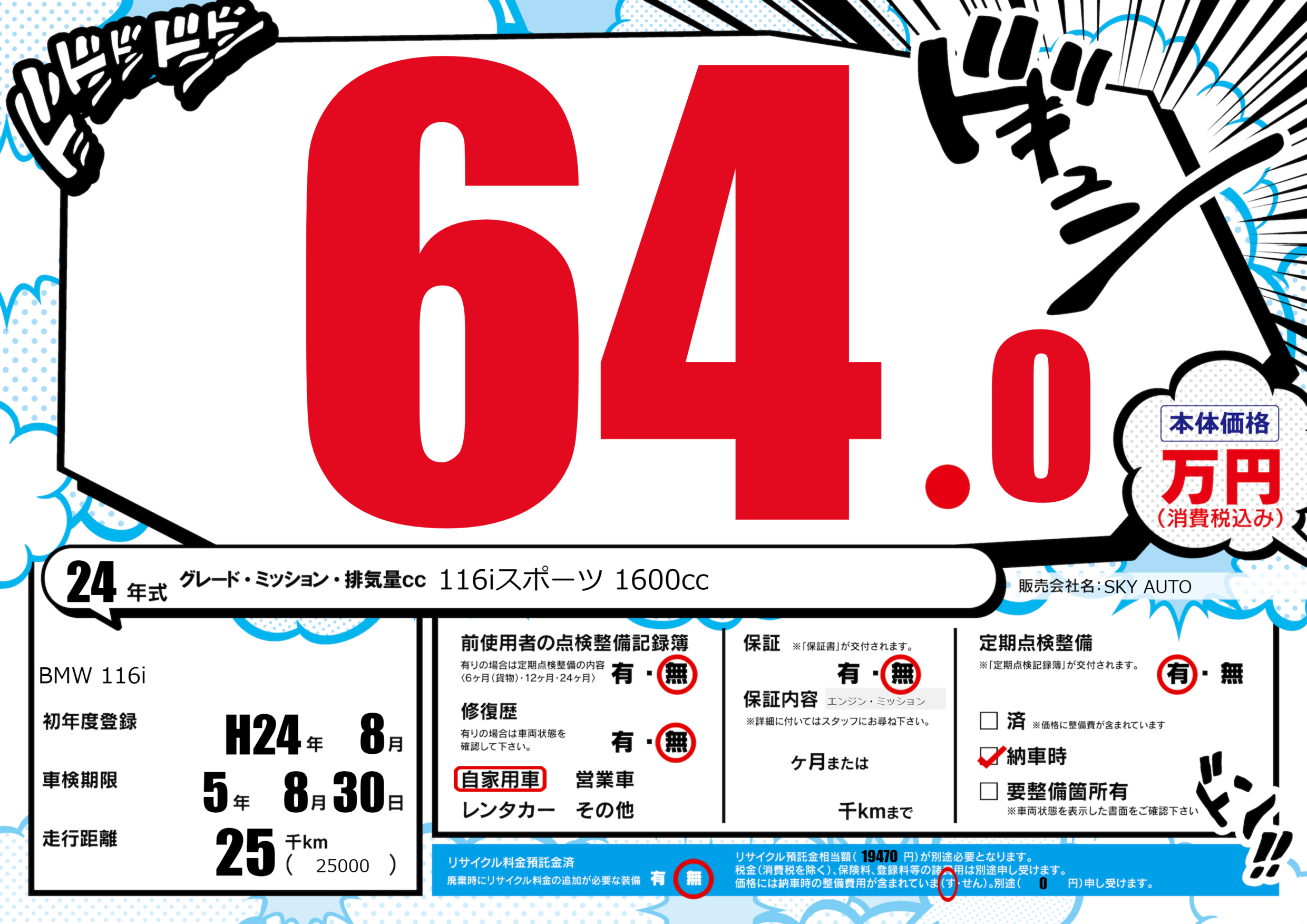 | 車名 | BMW 116i | グレード ミッション 排気量 |