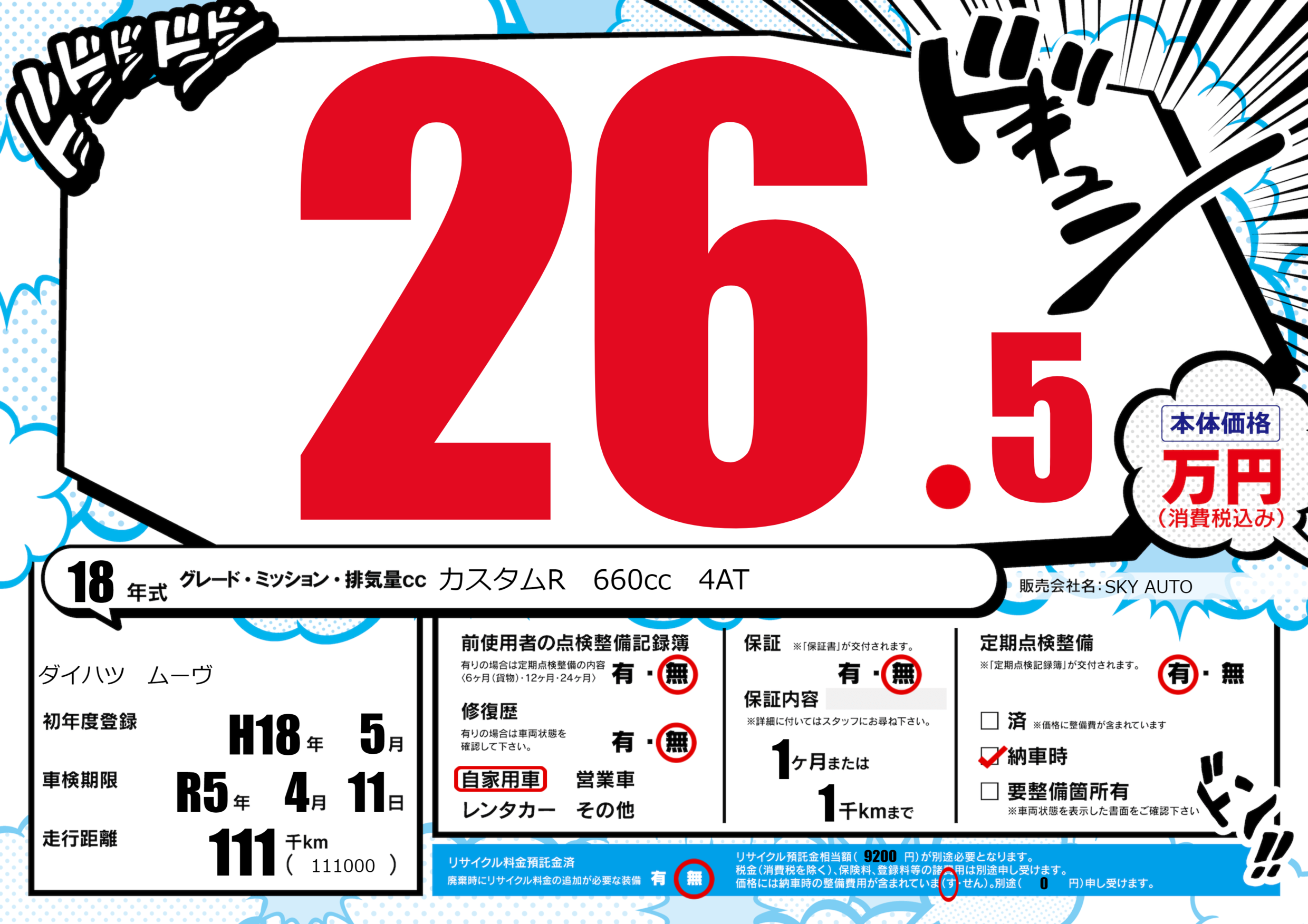 | 走行キロ | 11.1万km | 初年度登録 | H18年5月 |