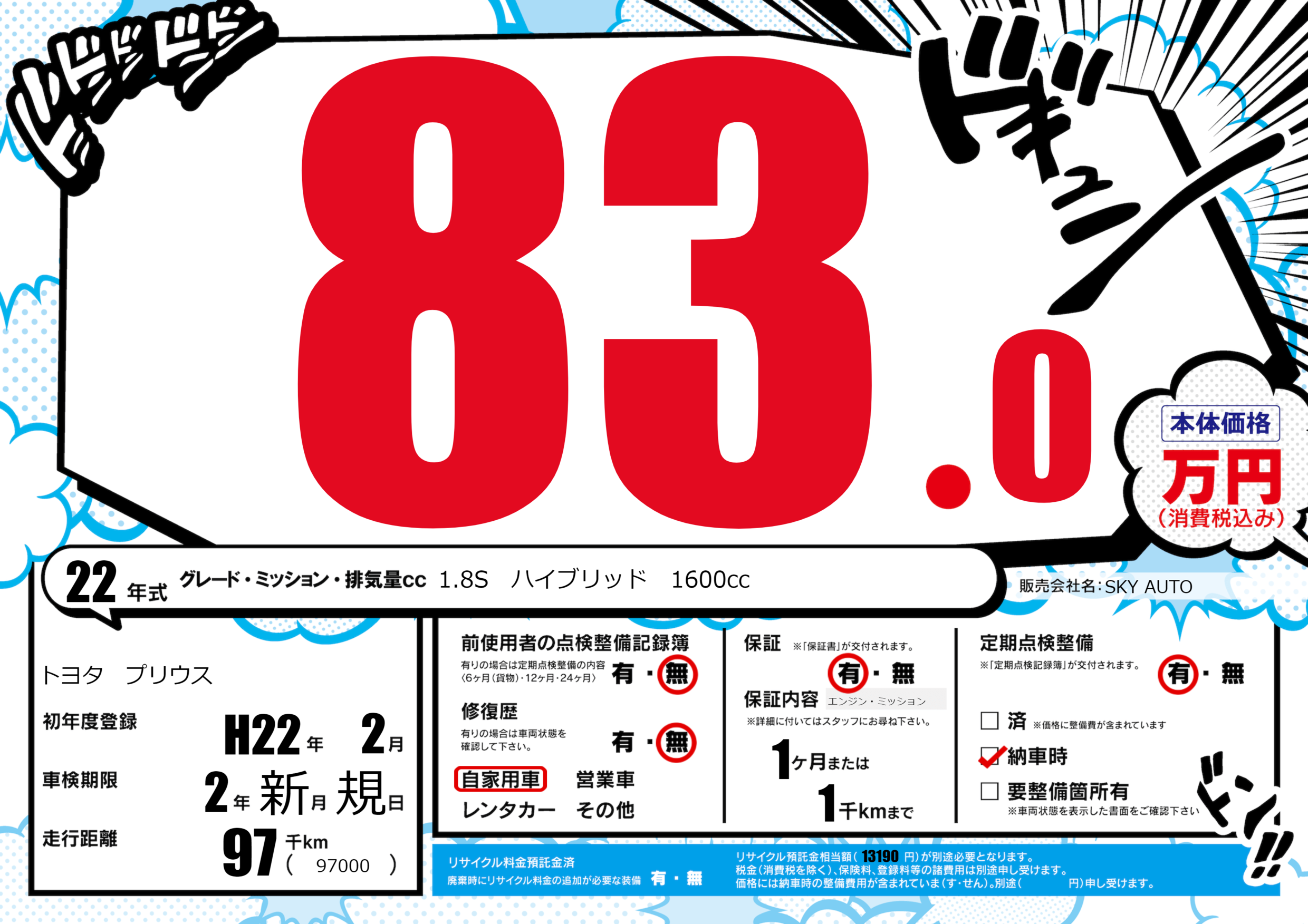 | 車名 | トヨタ プリウス | グレード ミッション 排気量 |