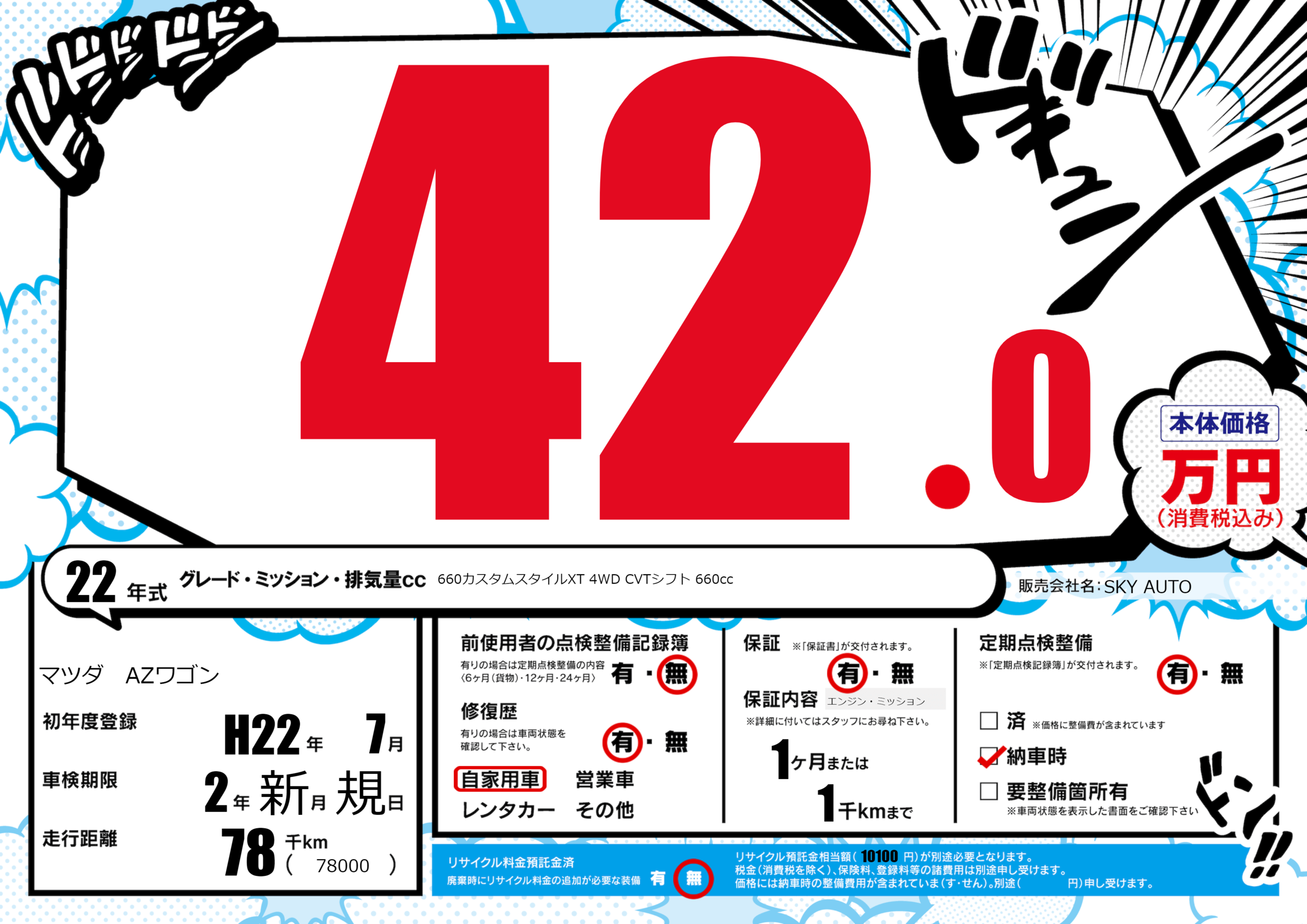 | 車名 | マツダ AZワゴン | グレード ミッション 排気量 |