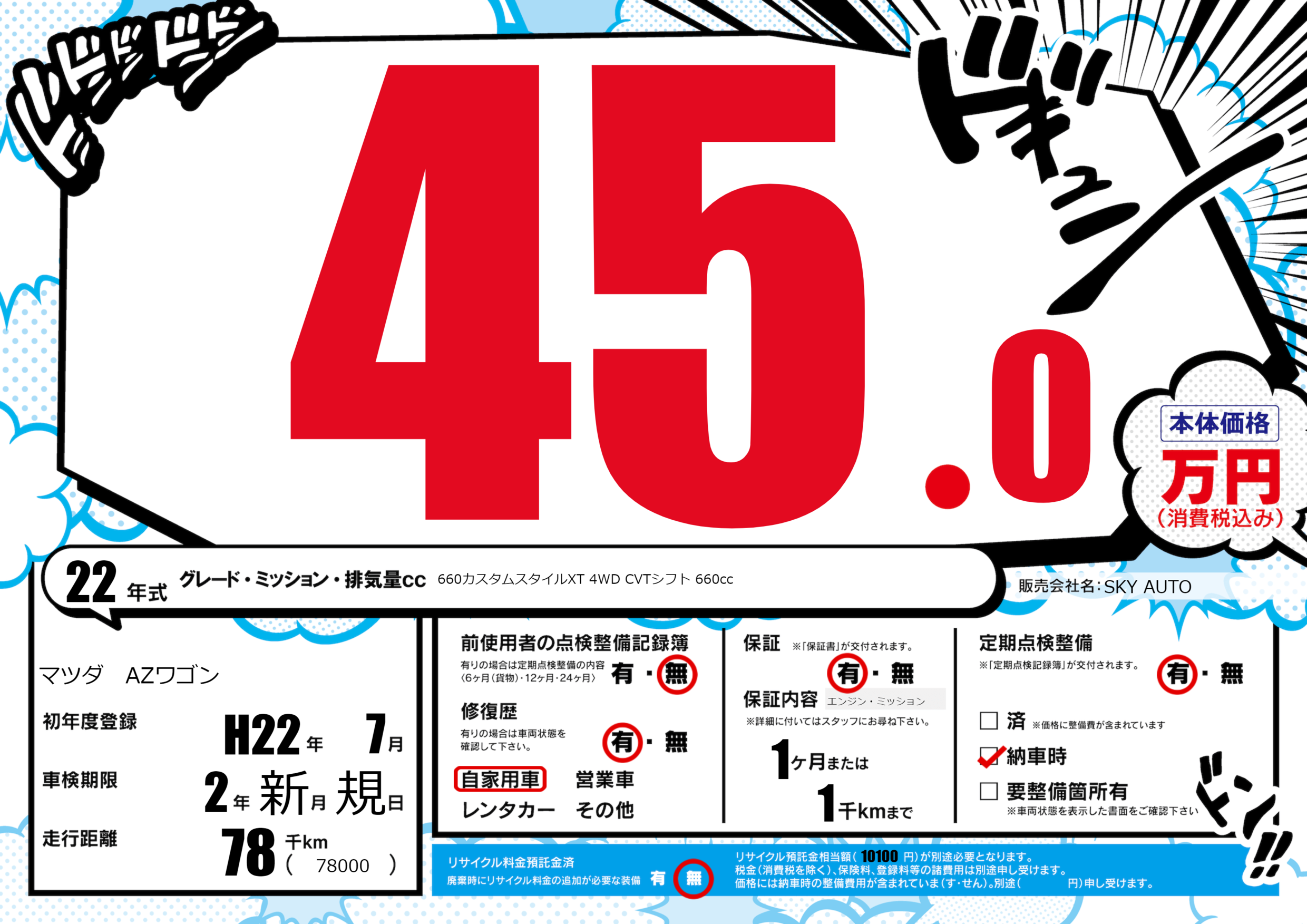 | 車名 | マツダ AZワゴン | グレード ミッション 排気量 |