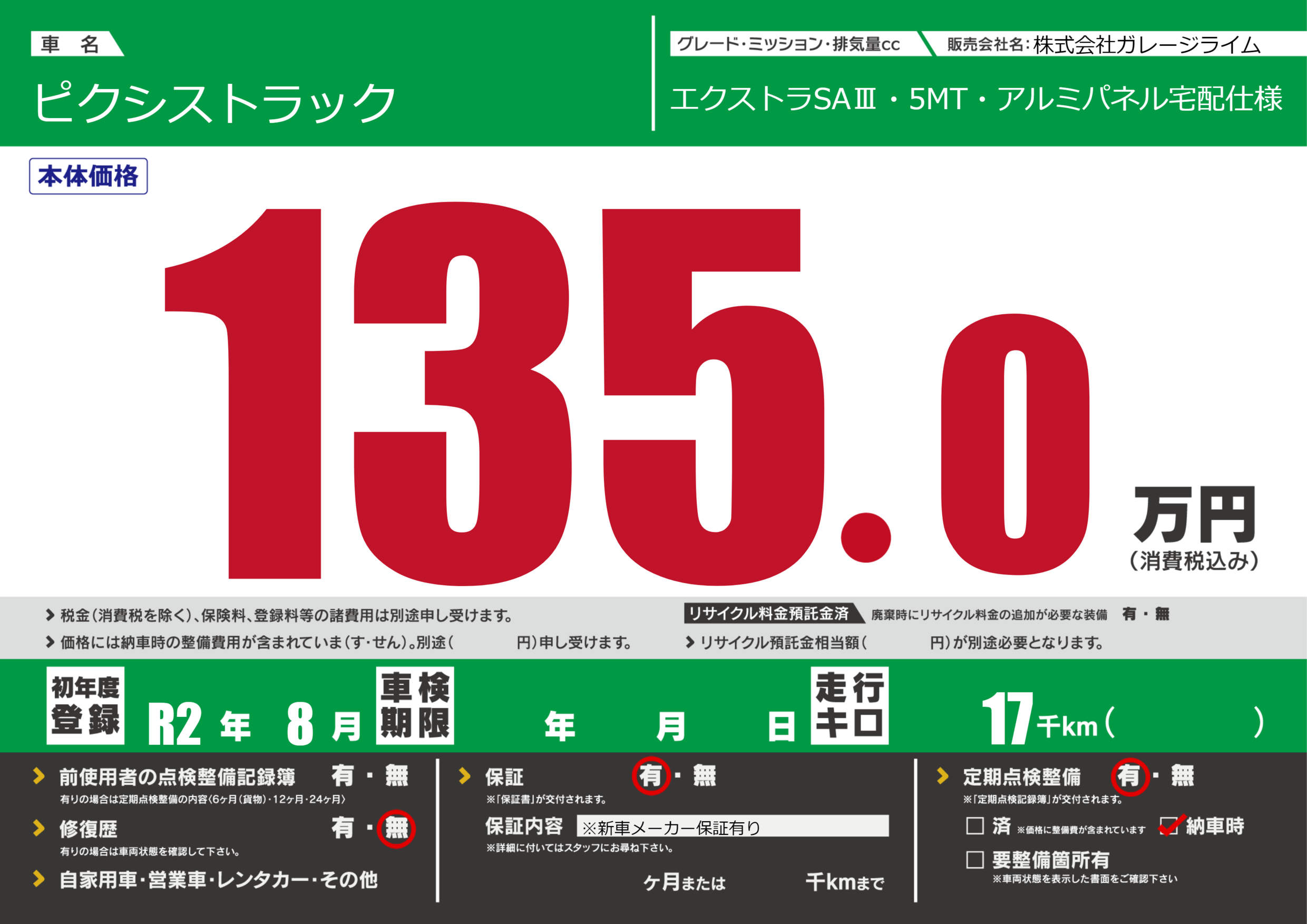 | 車名 | ピクシストラック | グレード ミッション 排気量 |