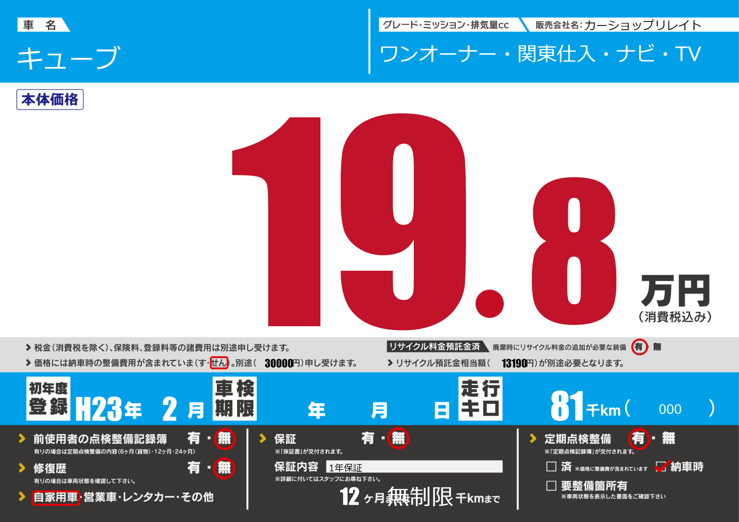 | 車名 | キューブ | グレード ミッション 排気量 |