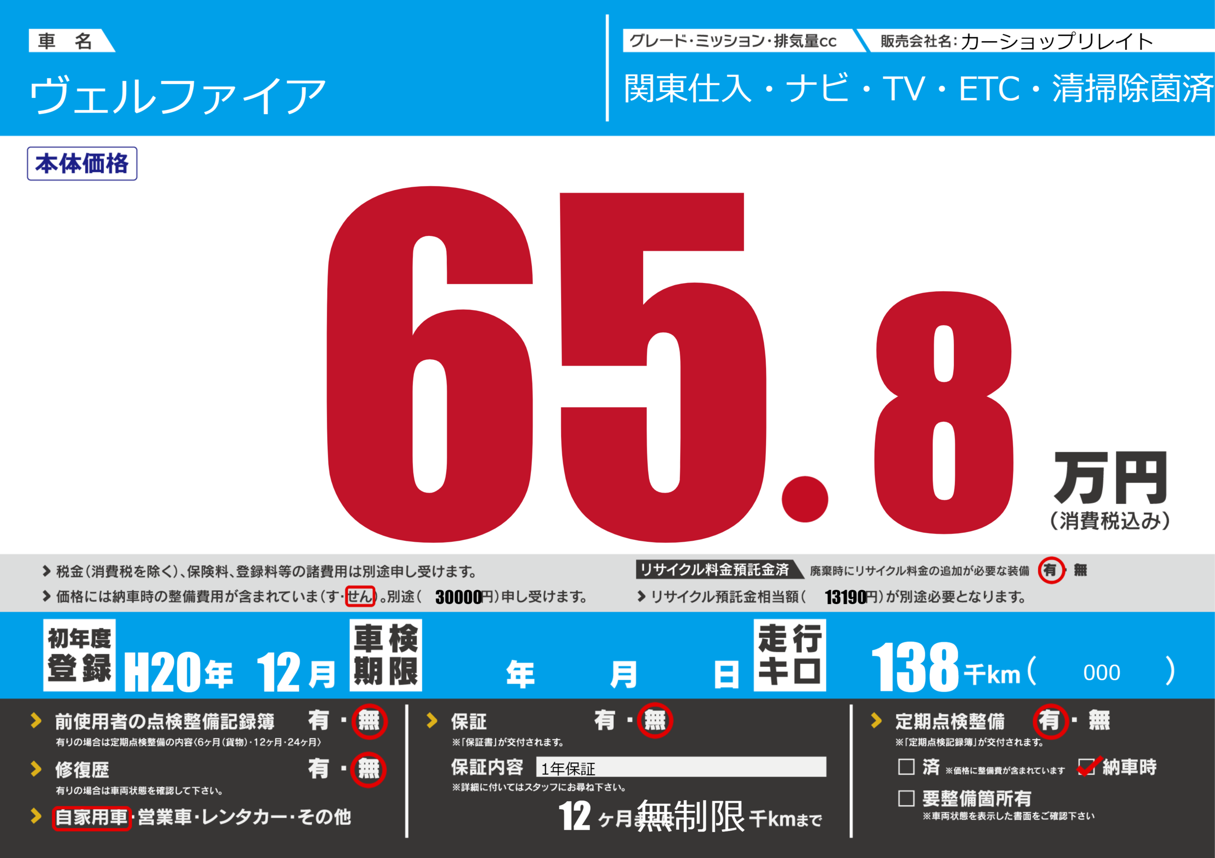 | 走行キロ | 13.8万km | 初年度登録 | H20年12月 |