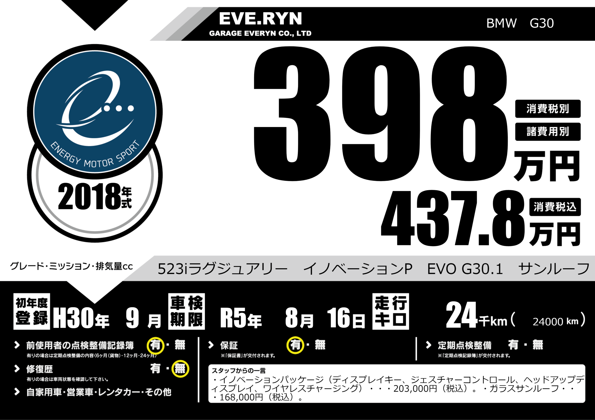 523iラグジュアリー イノベーションP EVO G30.1 サンルーフ |