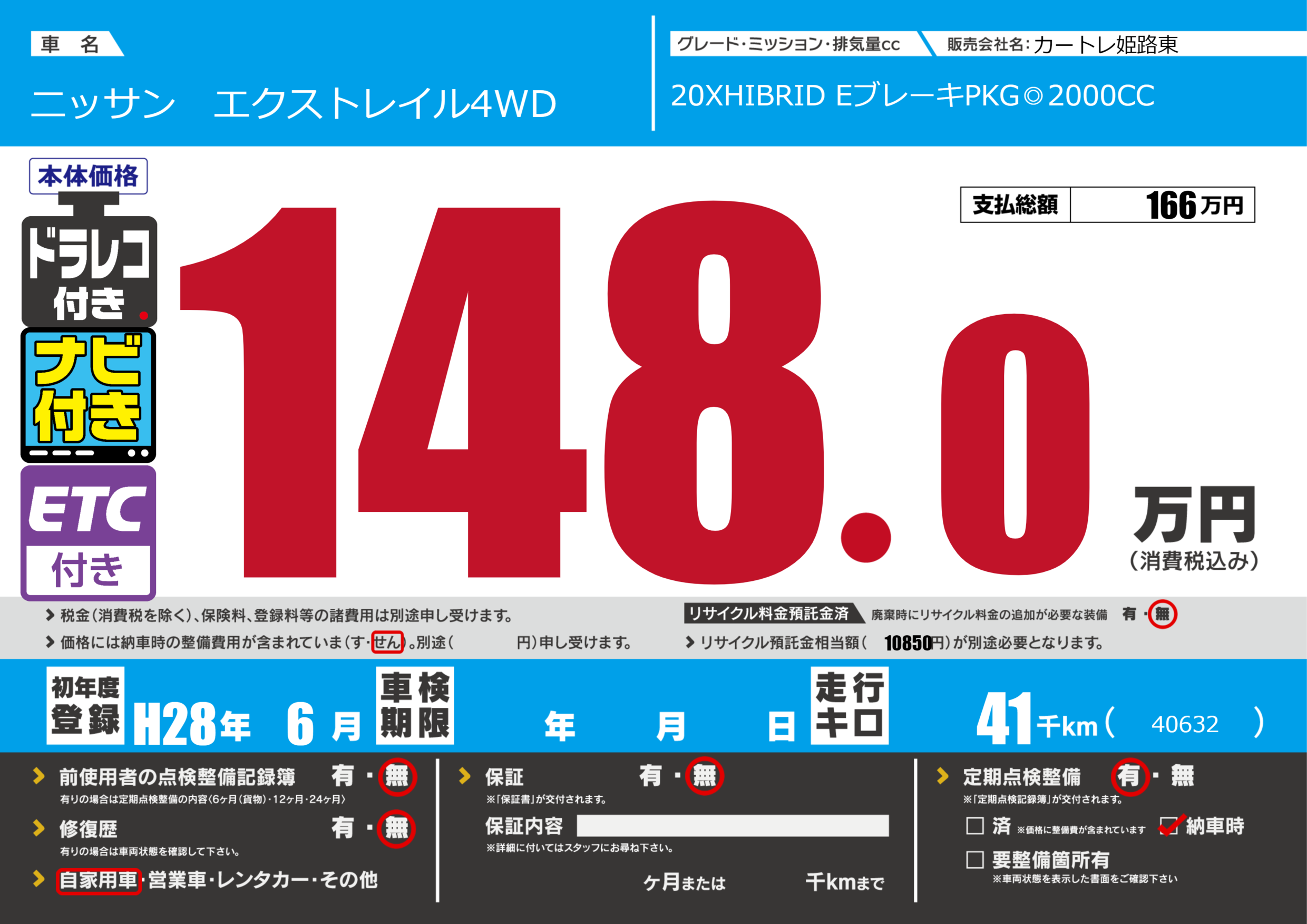 | 走行キロ | 4.1万km | 初年度登録 | H28年6月 |