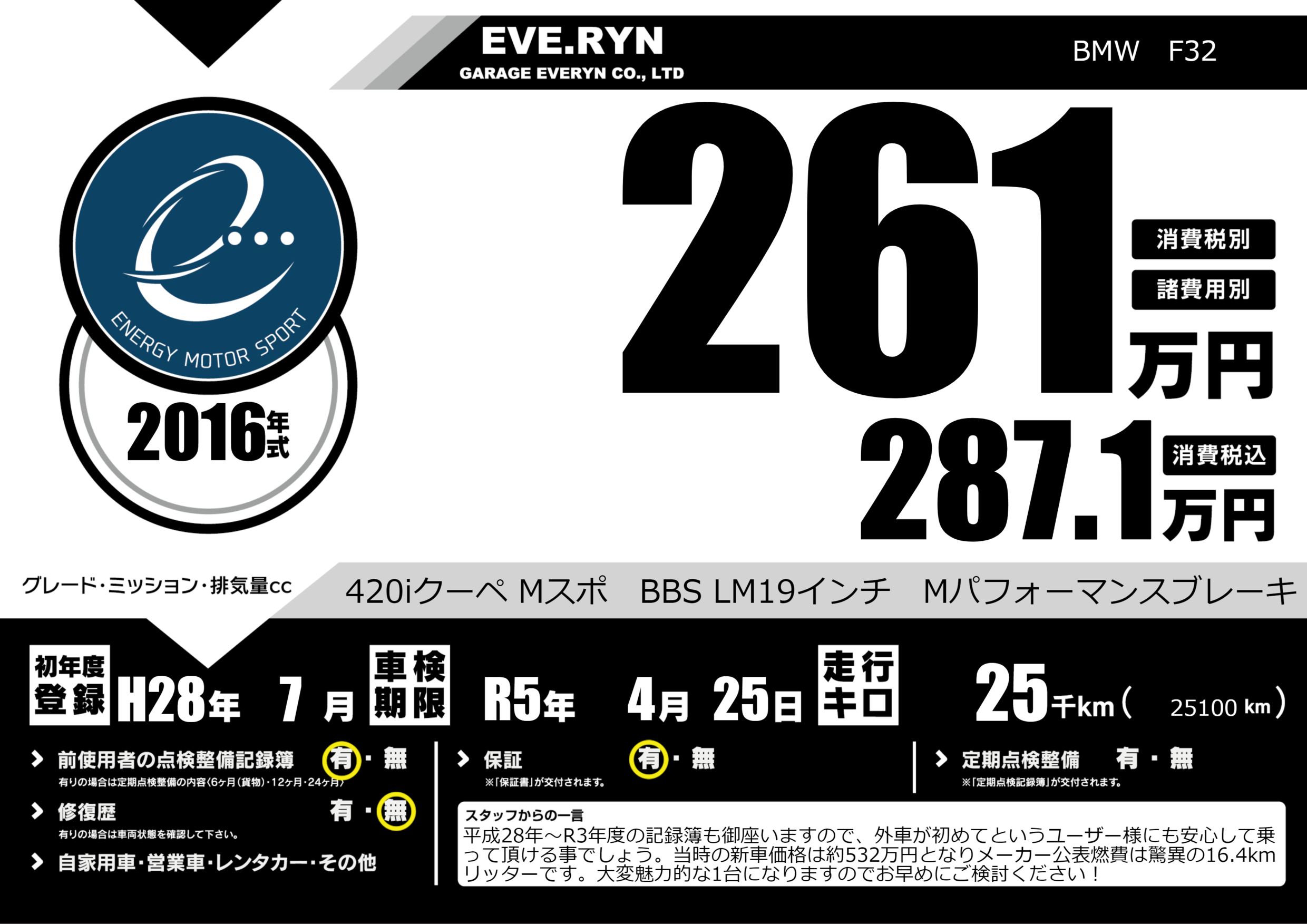 | 車名 | BMW F32 | グレード ミッション 排気量 |
